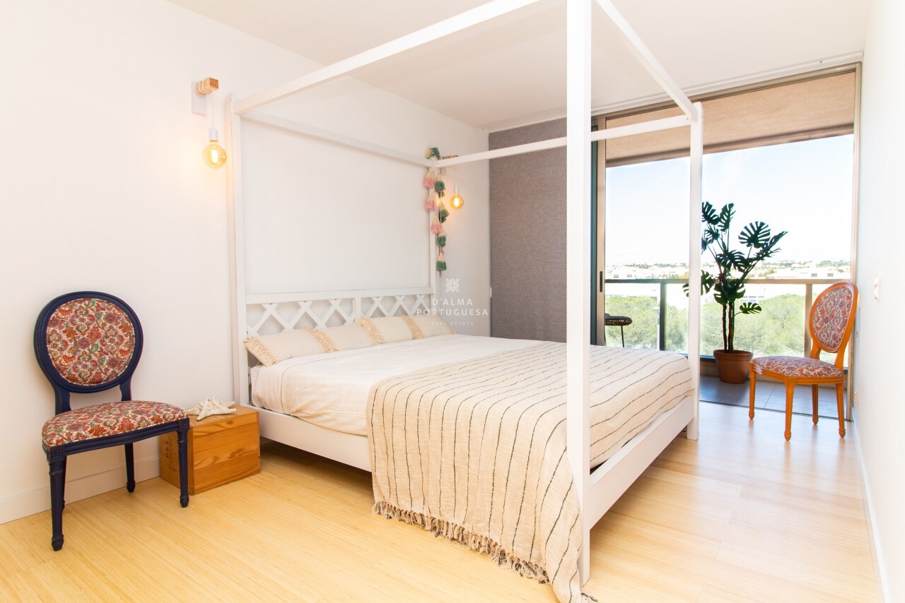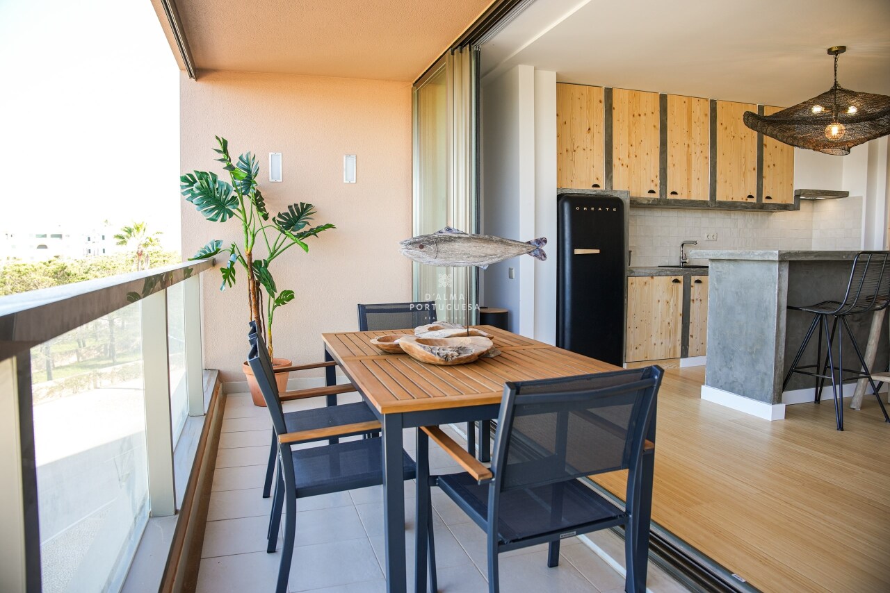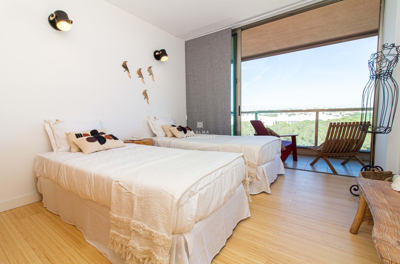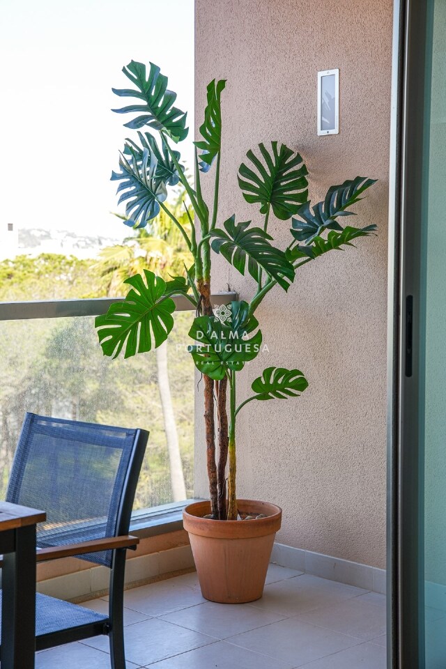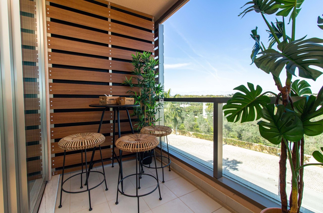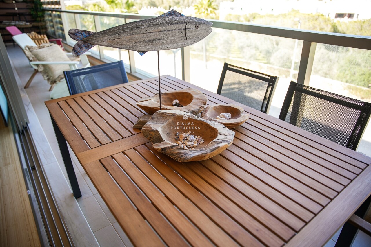 The living room, with its comfortable furnishings, is the perfect place to relax after a day on the golf course or on the golden sands of Salgados beach. Large sliding doors open onto the spacious balcony where you can take in stunning views of the golf course and listen to the soft murmur of the ocean waves in the distance.
