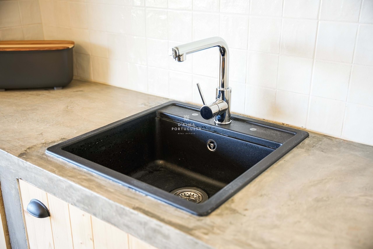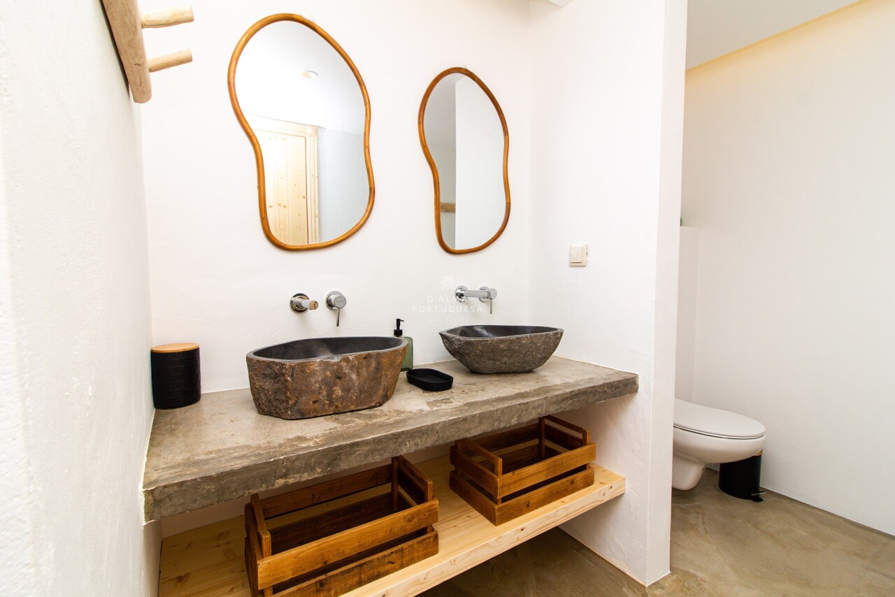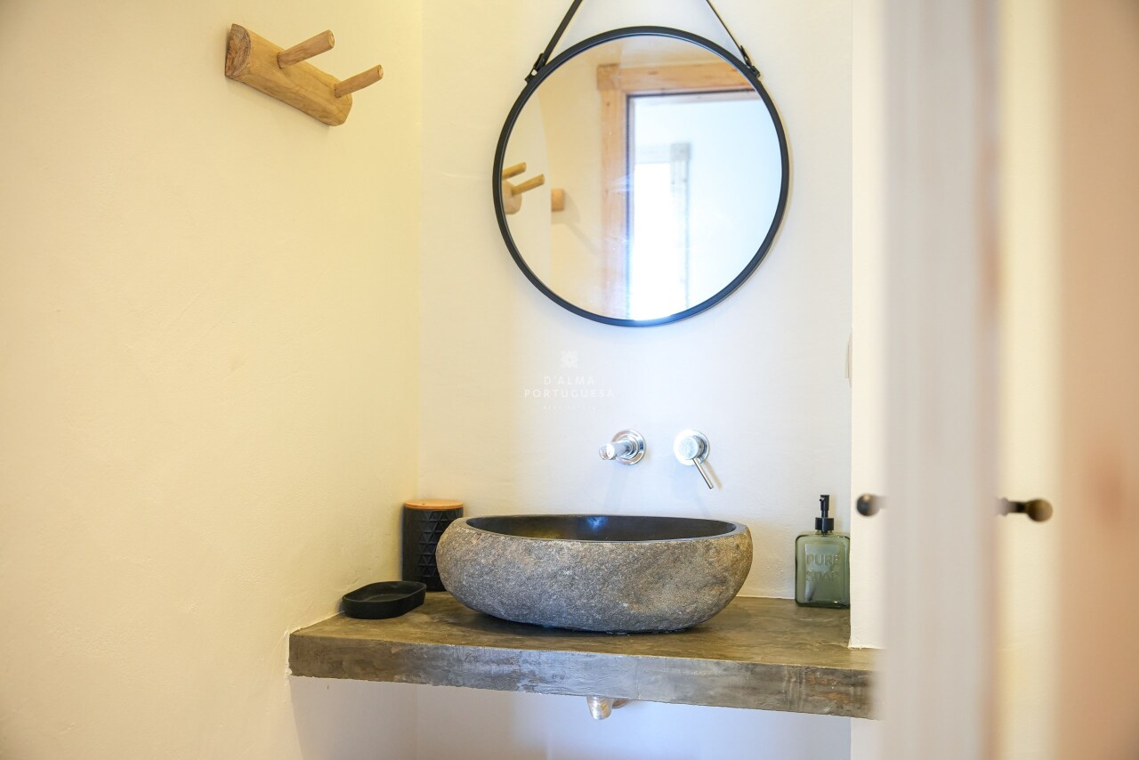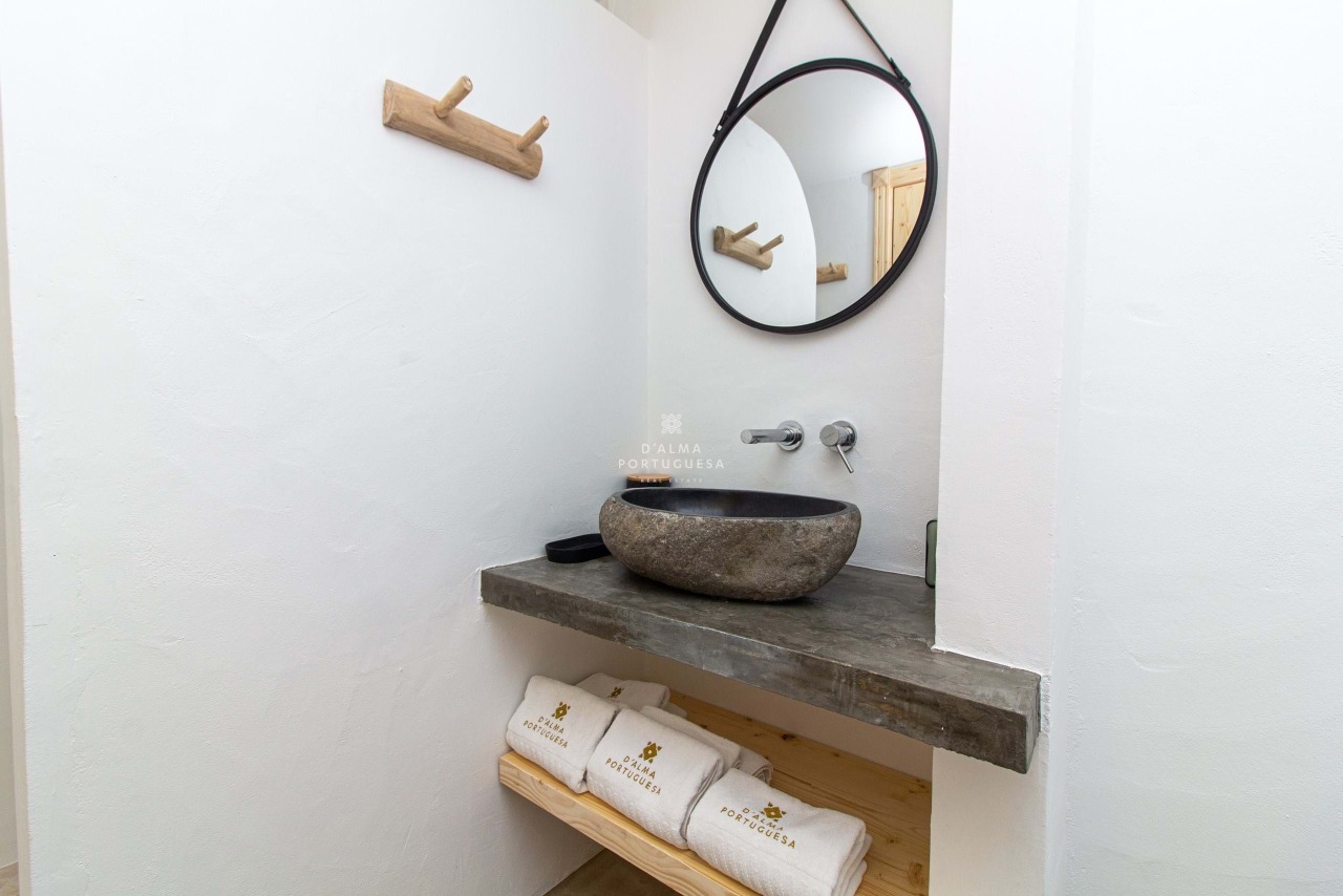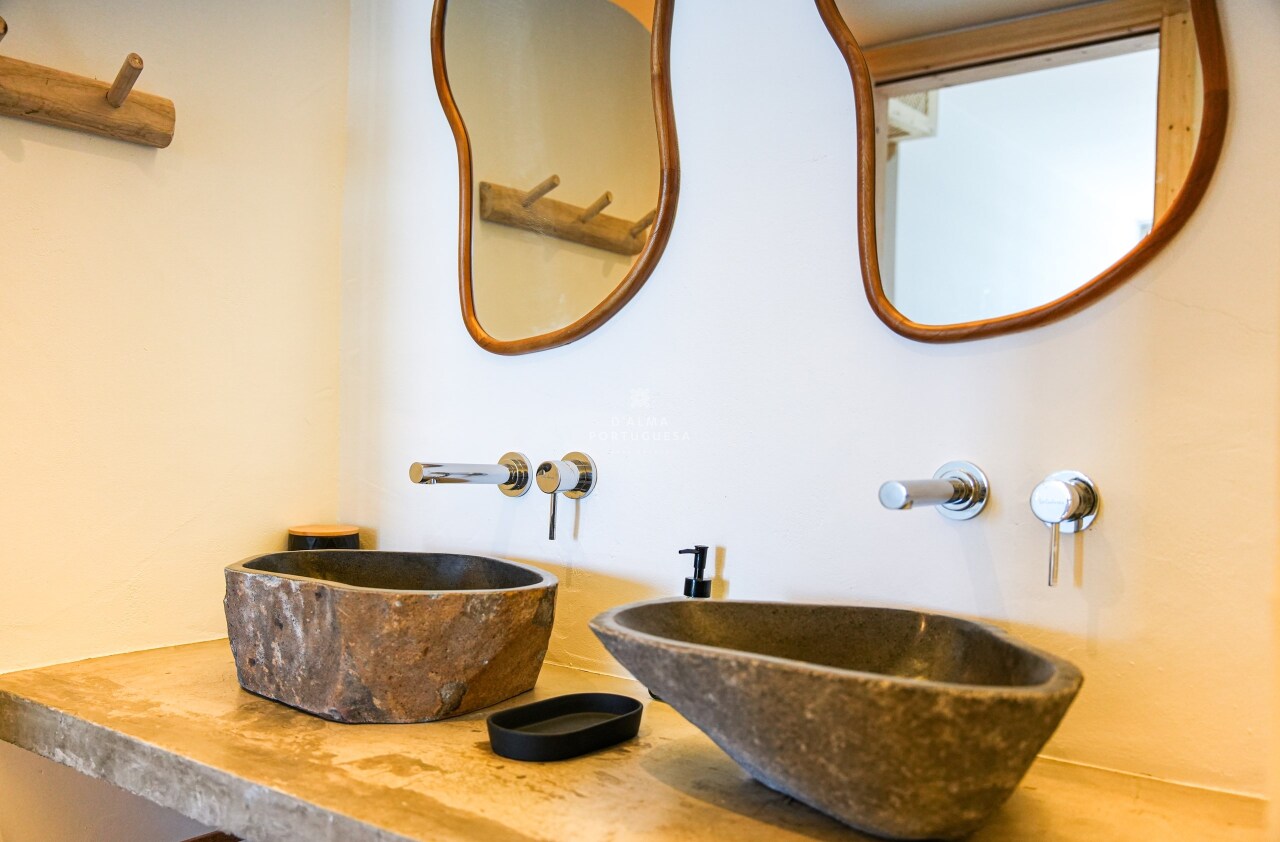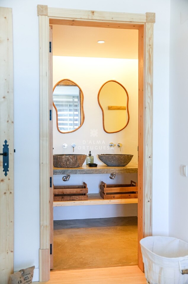 The microcement details on the countertops add an organic and modern texture, while the lime mortar on the walls of some spaces provides a feeling of freshness and authenticity in every corner.