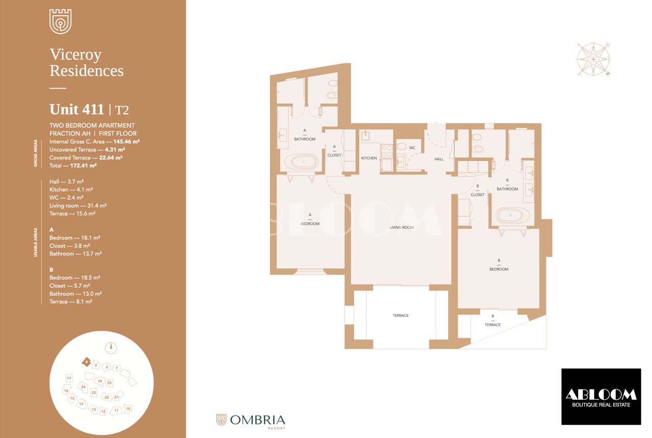 This first floor front line apartment offers 2 en-suite bedrooms, (plus guest WC) a fully equipped kitchenette, spacious living room and a covered terrace with views over the golf course and picturesque hills.The furniture pack in accordance with the 5* Viceroy standards is included. There are 65 x T1 and T2 apartments ranging from 781,200 to 1,214,100, and 12 villas in Alcedo Villas - ref 1064, T3 to T6 ranging from 2,750,000 to 4,000,000. (Also coming soon Oriole Village)