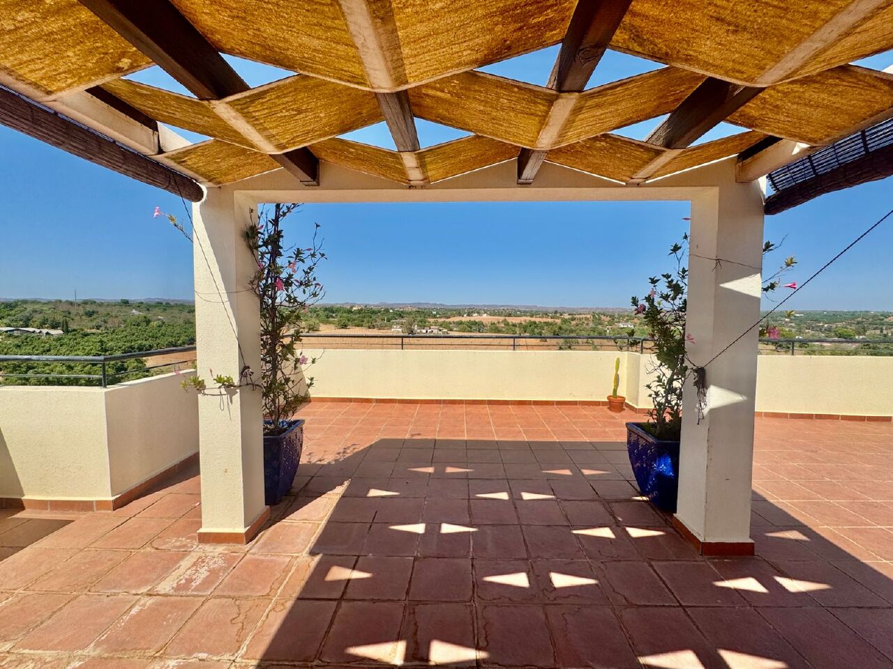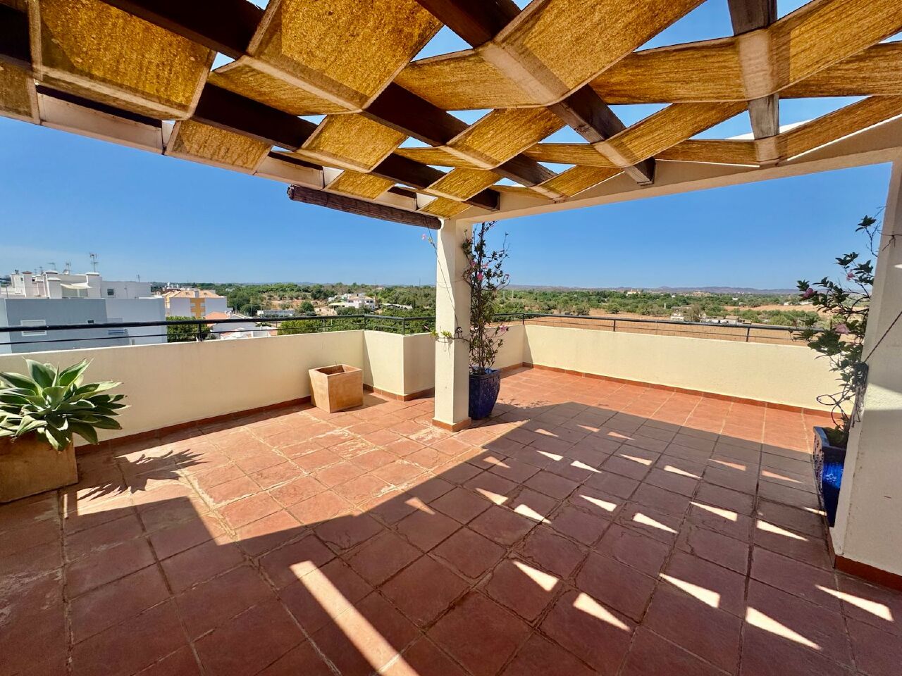 Description: Modern top floor two bedroom apartment with two balconies, a large private roof terrace and a parking space with store room in the garage located in a quiet and green residential area known for its tree lined streets with cafes and restaurants at your doorstep. The property consists of a hallway leading to a good size living room with dining area, a modern kitchen (fully fitted and equipped) with a natural stone worktop, a storeroom and breakfast area. The apartment has two good size double bedrooms with built-in wardrobes sharing a family bathroom with bath and shower. Access from the kitchen, the living room and one of the bedrooms has access onto the terrace in front of the living room from where you have very nice views over the mountains. The second bedroom has access to a smaller terrace from where you can enjoy the beautiful sunsets in the Algarve. The real gem of the property is the large private roof terrace with, outdoor shower, fitted BBQ and outdoor kitchen from where you have beautiful country views. A private underground parking space with store room completes this well presented home. The property benefits from an elevator, double glazing, security shutters, air-conditioning and CCTV.