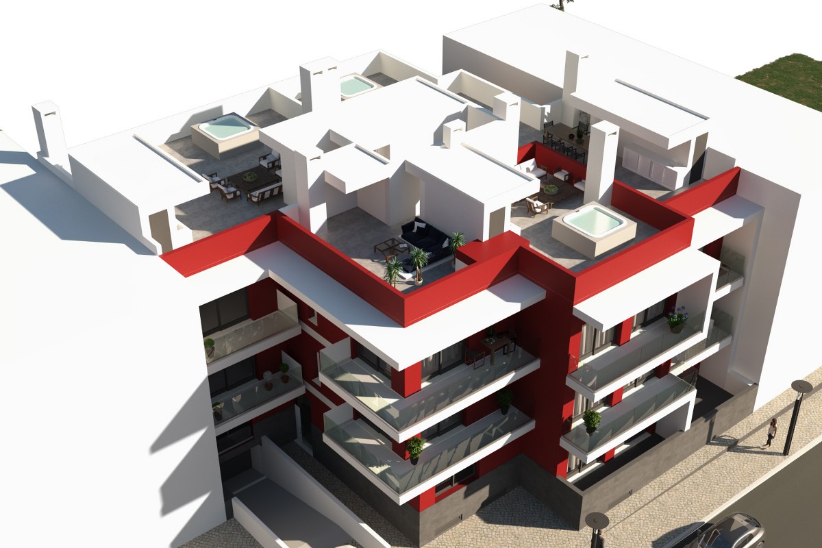 Description: Spectacular two or three bedroom/two bathroom penthouse apartments with direct access to a private roof terrace with a pre-installation for a Jacuzzi and a garage, located in the center of Tavira near all amenities. The properties for sale (3 in total) are situated in a small and exclusive building with 9 apartments only. The three bedroom apartments consist of a hallway with a bathroom, a fully equipped kitchen (BOSCH appliances) and a good size living room with a staircase leading to the private roof terrace of 95 m2 with a pre-installation of a Jacuzzi / hot tub. In addition there is a Master bedroom with en-suite bathroom, two double bedrooms and various terraces off every room in the apartment. The two bedroom apartment consist of a hallway with a bathroom, a good size living room, a fully equipped kitchen (BOSCH appliances), the Master bedroom with en-suite bathroom, in addition to a double bedroom. All rooms have an access to various terraces and the private roof terrace of 83 m2 can be reached directly by the staircase in the living room. The penthouses are equipped with double glazing, security shutters, air-conditioning, built-in wardrobes, elevator, CCTV, pre-installation for a central vacuum cleaning system and a Jacuzzi, solar panels for hot water and under floor heating. Mains electricity, water and gas. Note: Construction has started and completion is expected in summer 2021.
