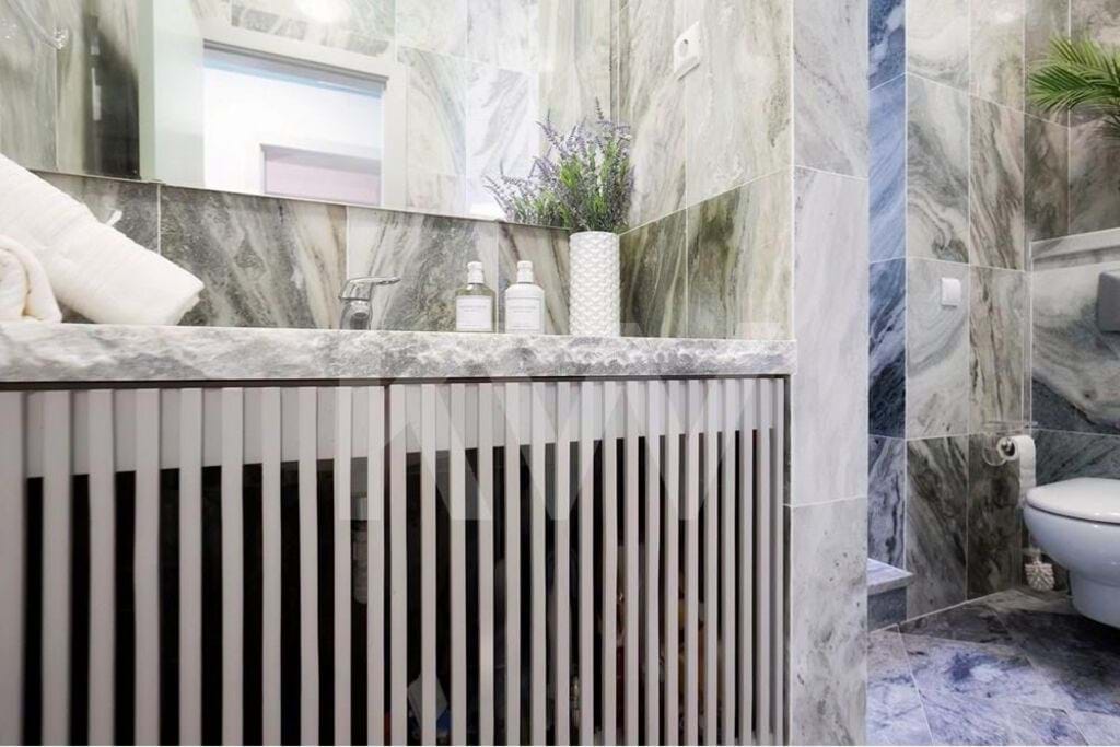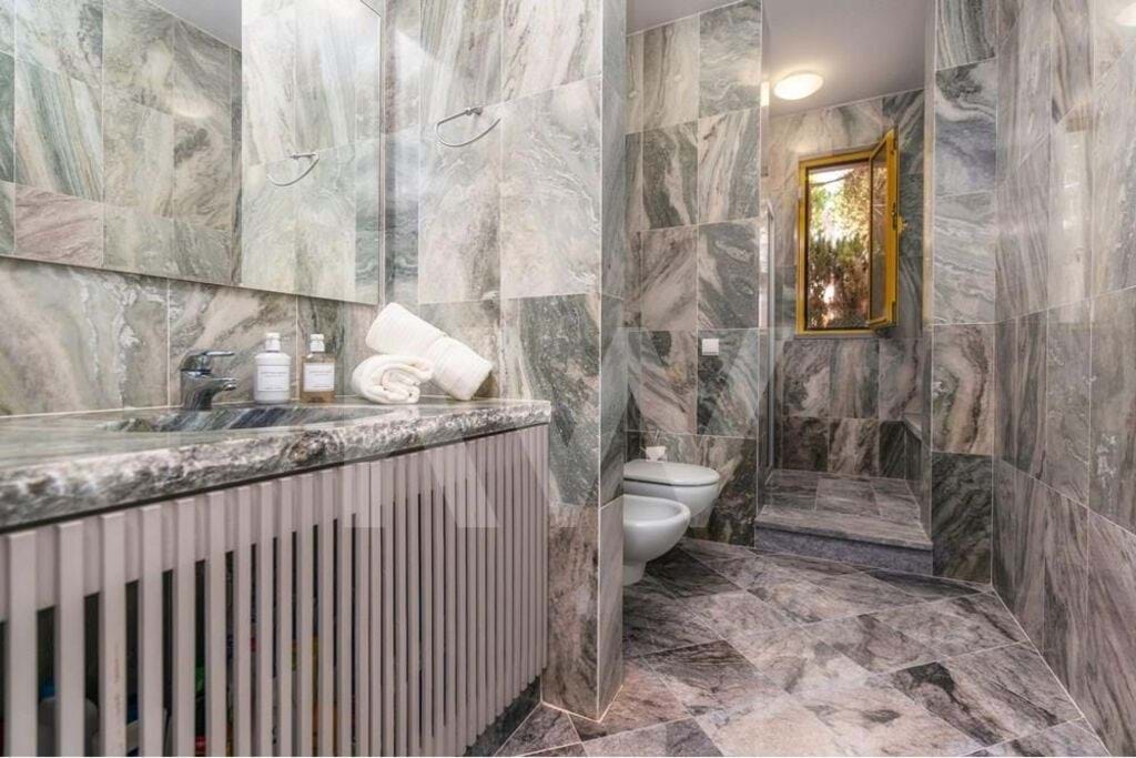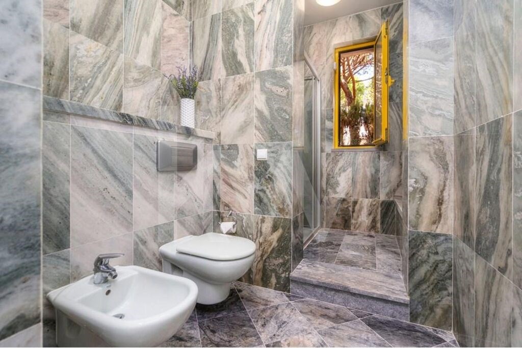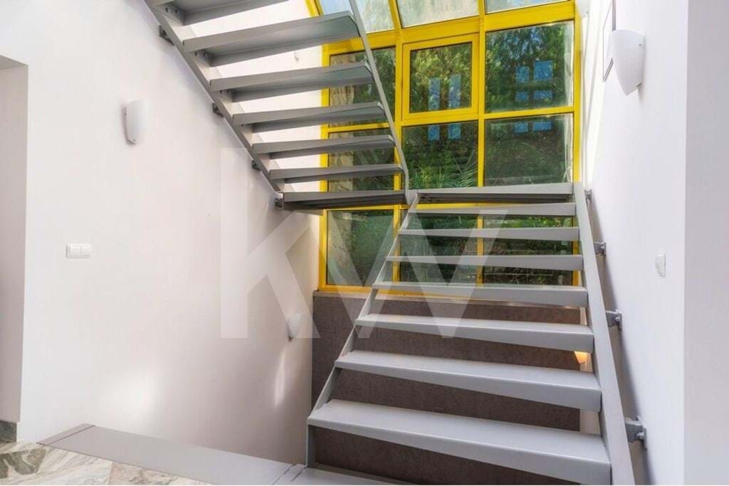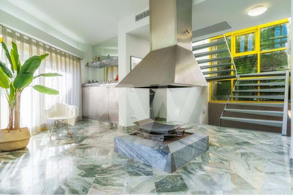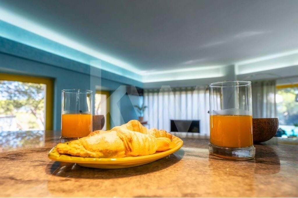 Upon entering the villa we have a generous and spacious entrance hall, which separates the social and rest area, on the first floor we have three en suite bedrooms, and access to the garage from the inside, the living and dining room with fireplace has large windows overlooking the garden pool and giving access to the outside, equipped and furnished kitchen, barbecue and a support kitchen on the top floor of the villa, where there is a terrace with sea views, perfect for enjoying meals outside.The garage of the villa is equipped with a bathroom.