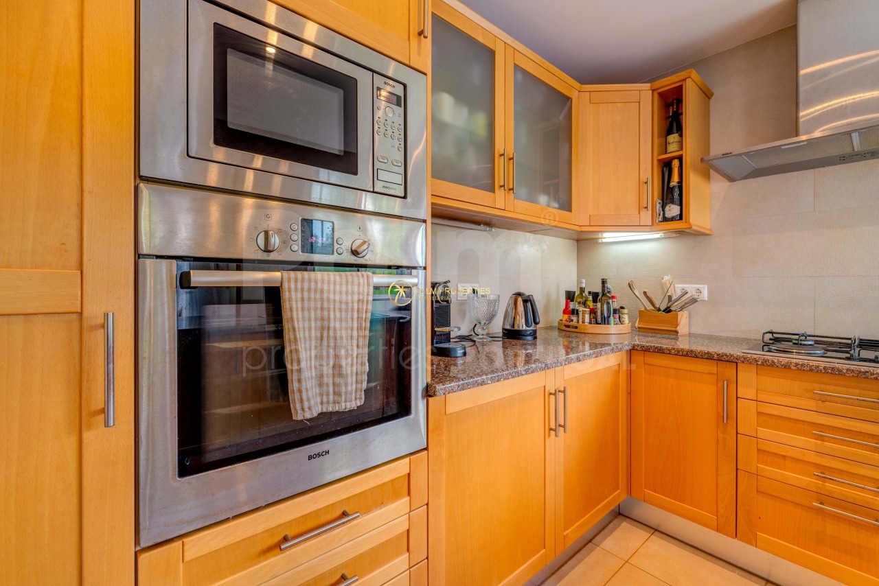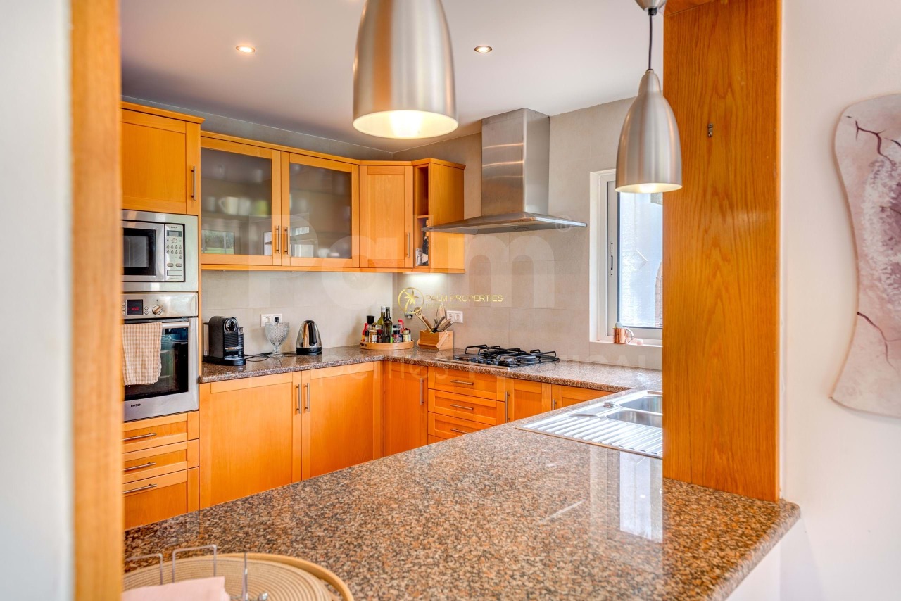 On the ground floor, the villa features an entrance hall leading to a spacious living and dining area with sliding doors opening onto a covered terrace, perfect for entertaining. The fully equipped kitchen and a bedroom with en-suite bathroom, built-in wardrobes, and garden access complete this level, along with a guest bathroom.