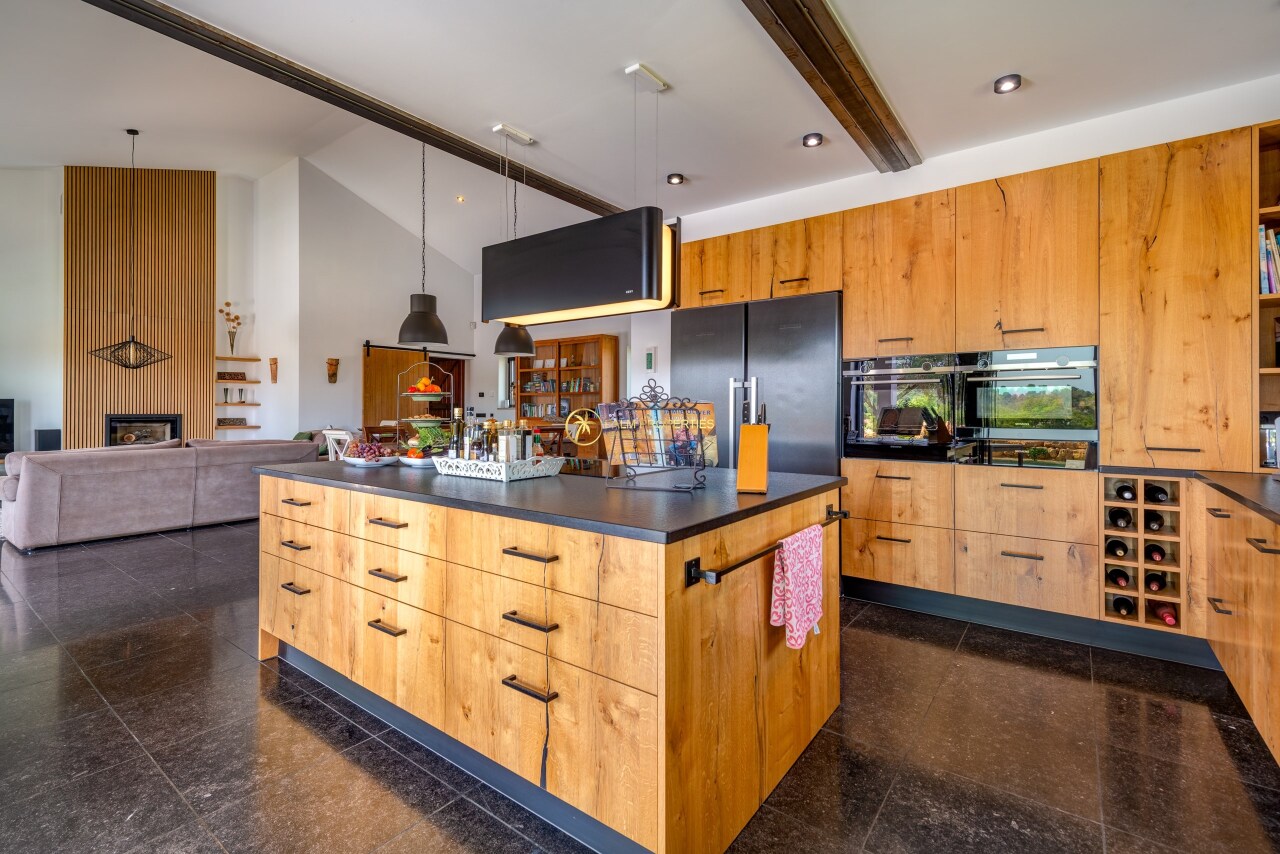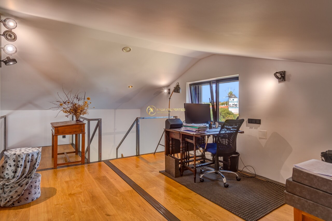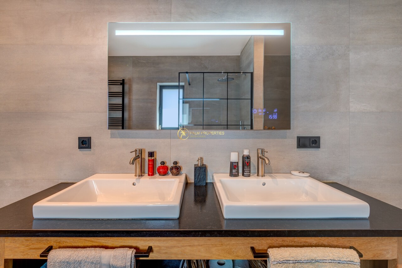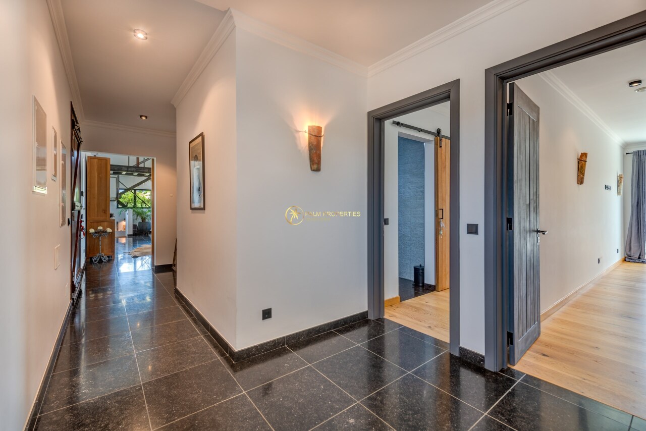 Access is secure and convenient, with a 5-metre electric gate featuring a video intercom, a separate pedestrian entrance, and remote operation for maximum privacy. The generous 100 m² living area integrates a lounge, dining zone, and an open-plan kitchen equipped with premium appliances, including a Liebherr double fridge freezer, Siemens induction hob, oven, microwave, steam cooker, and plate warmer. The large natural Zimbabwe boucharde stone island is perfect for meal preparation or entertaining guests, complemented by an elegant black steel Novy extractor. Above the kitchen, a mezzanine offers versatile space for an office, extra bedroom, or leisure area. All tilt-and-turn windows and sliding doors feature double glazing, electric shutters, and mosquito screens, ensuring year-round comfort and functionality.