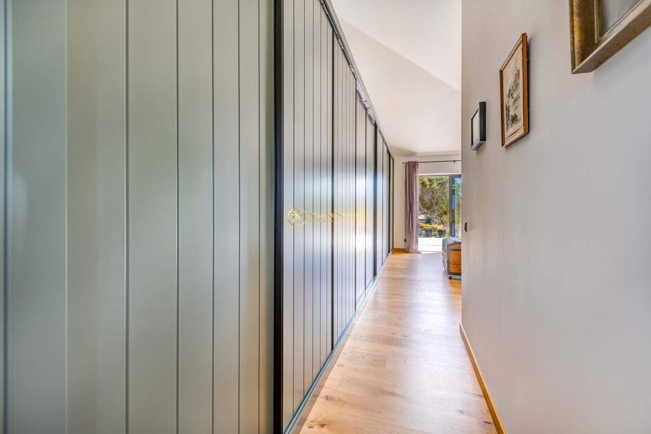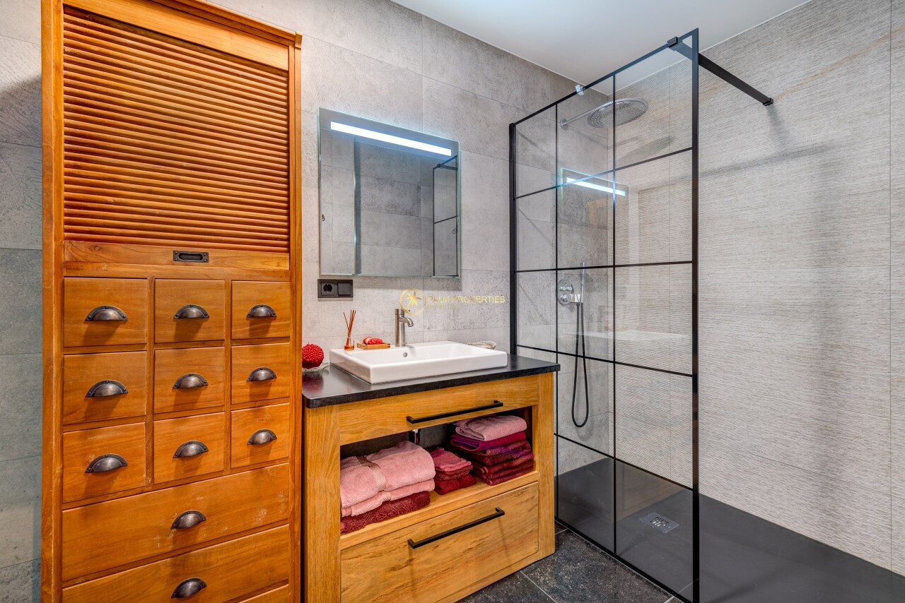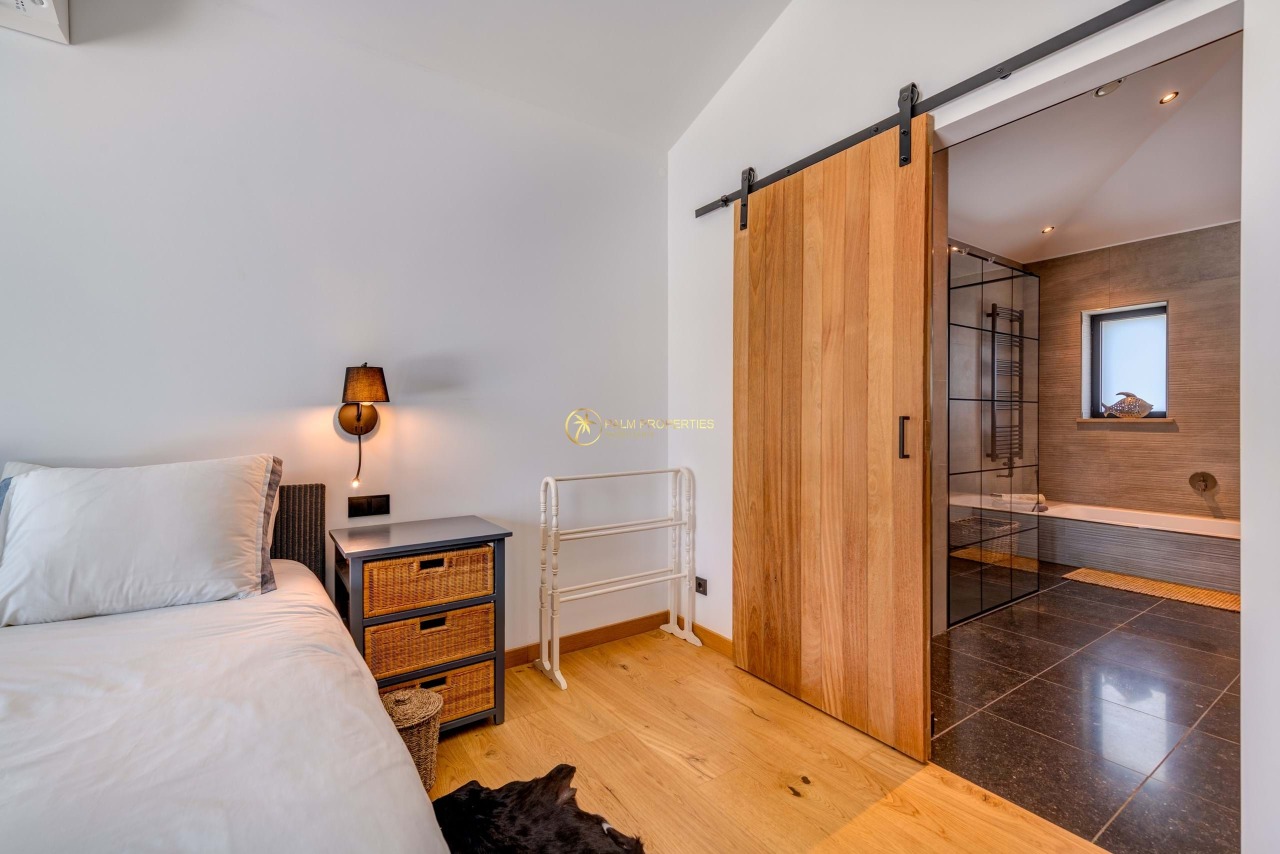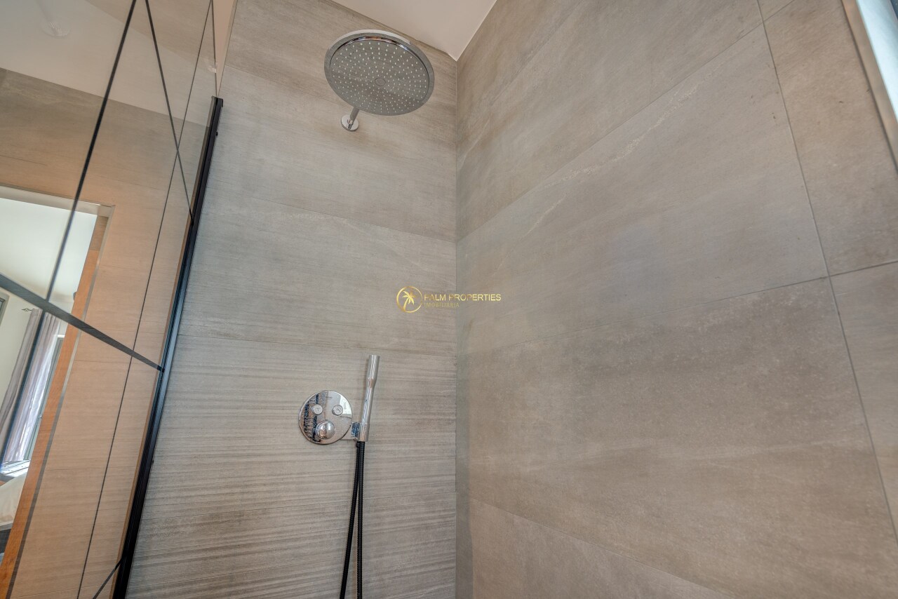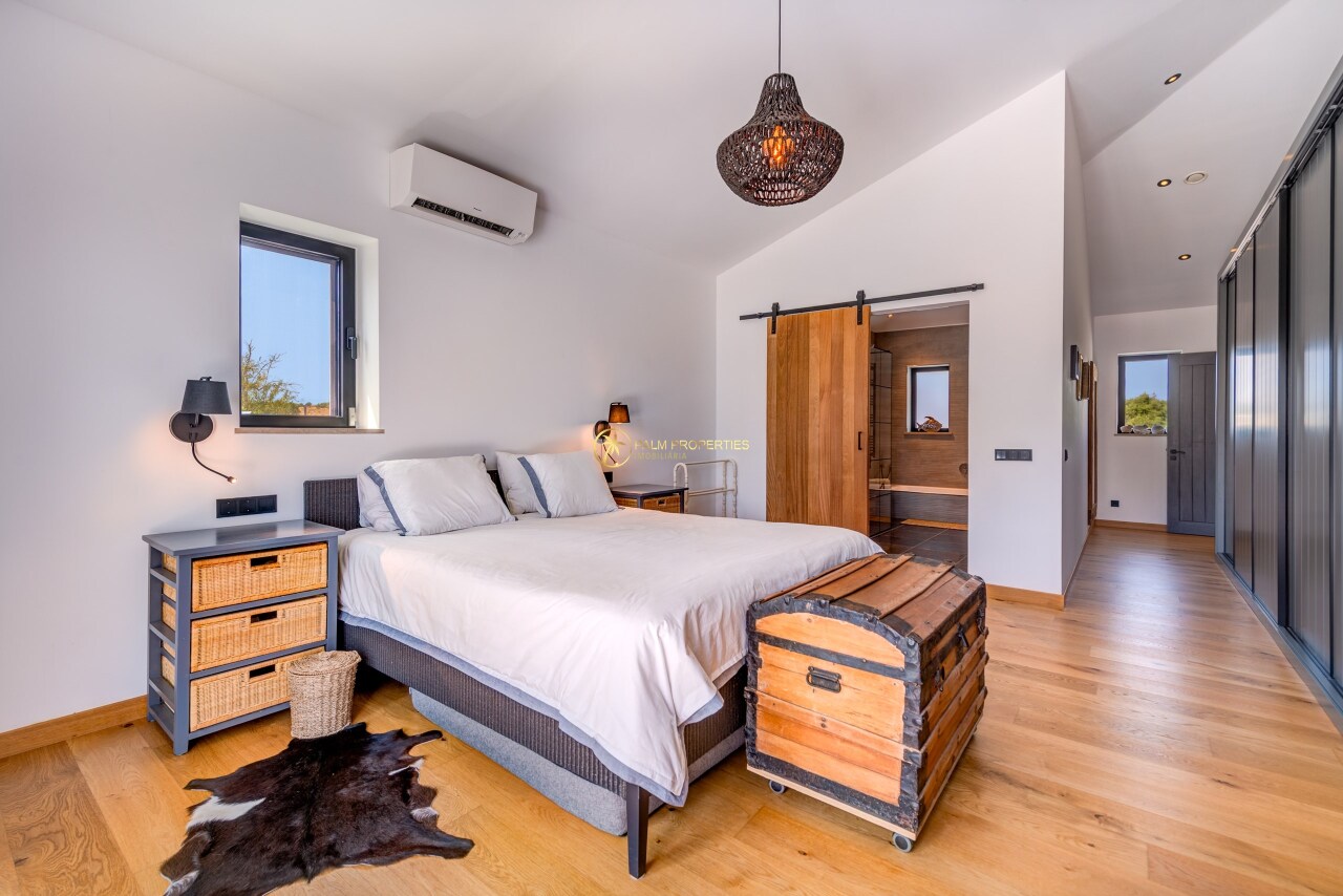 The villa offers three bedrooms, each with an en-suite bathroom and direct access to the heated saltwater infinity pool. All bedrooms and bathrooms feature Giacomini underfloor heating with dual heating and cooling functions, ensuring comfort in all seasons with reduced electricity costs. The master suite includes built-in wardrobes and a dedicated TV space, while its en-suite bathroom features both a shower and a low bathtub. High-quality Brazilian Cherry wood finishes and high ceilings enhance the propertys refined and elegant character.