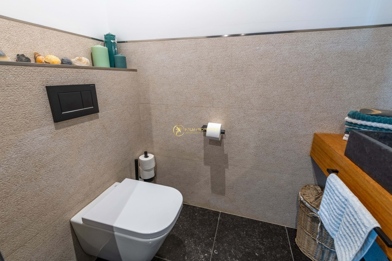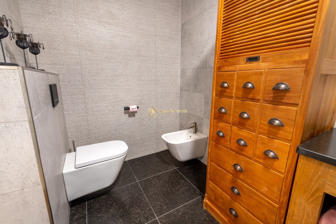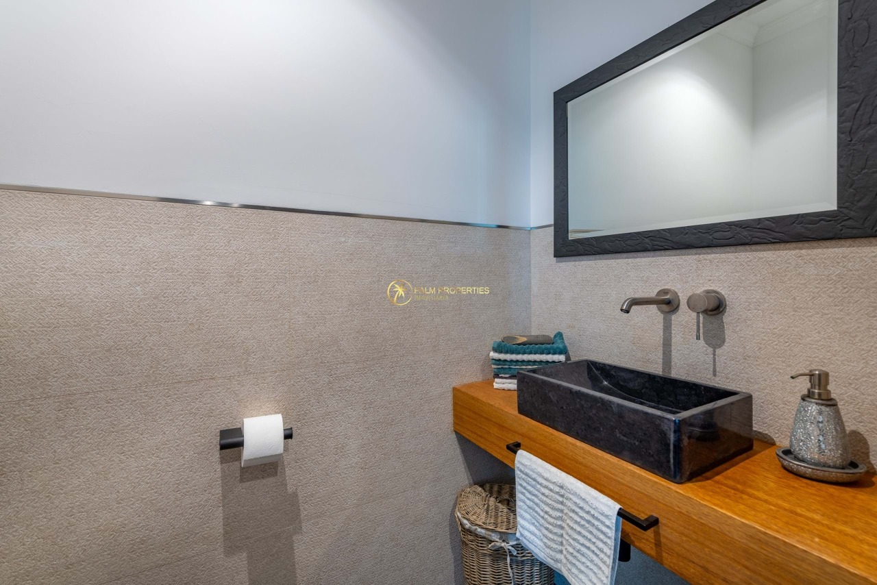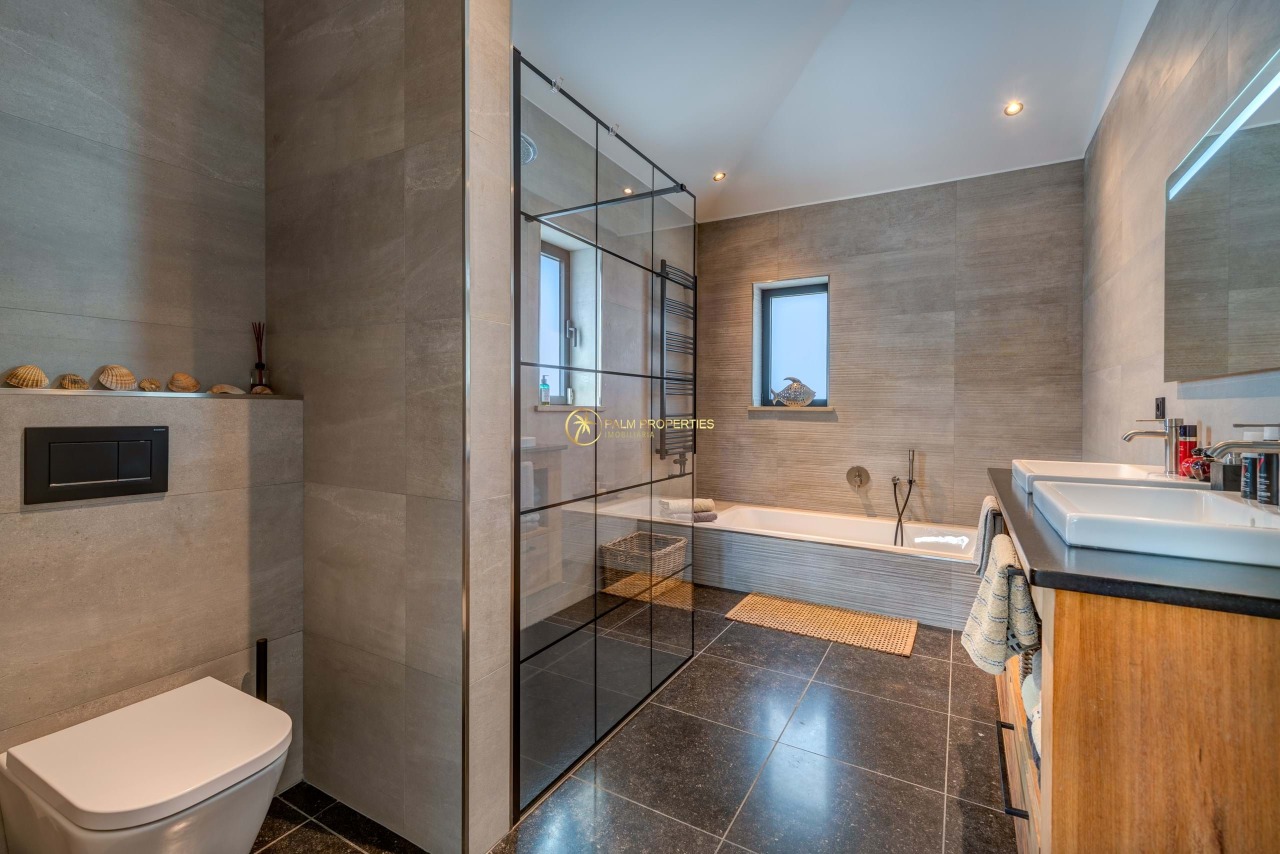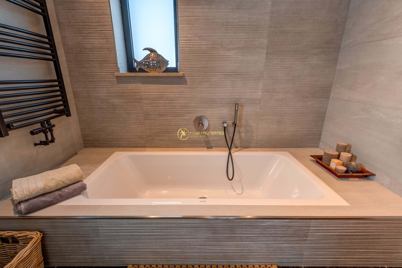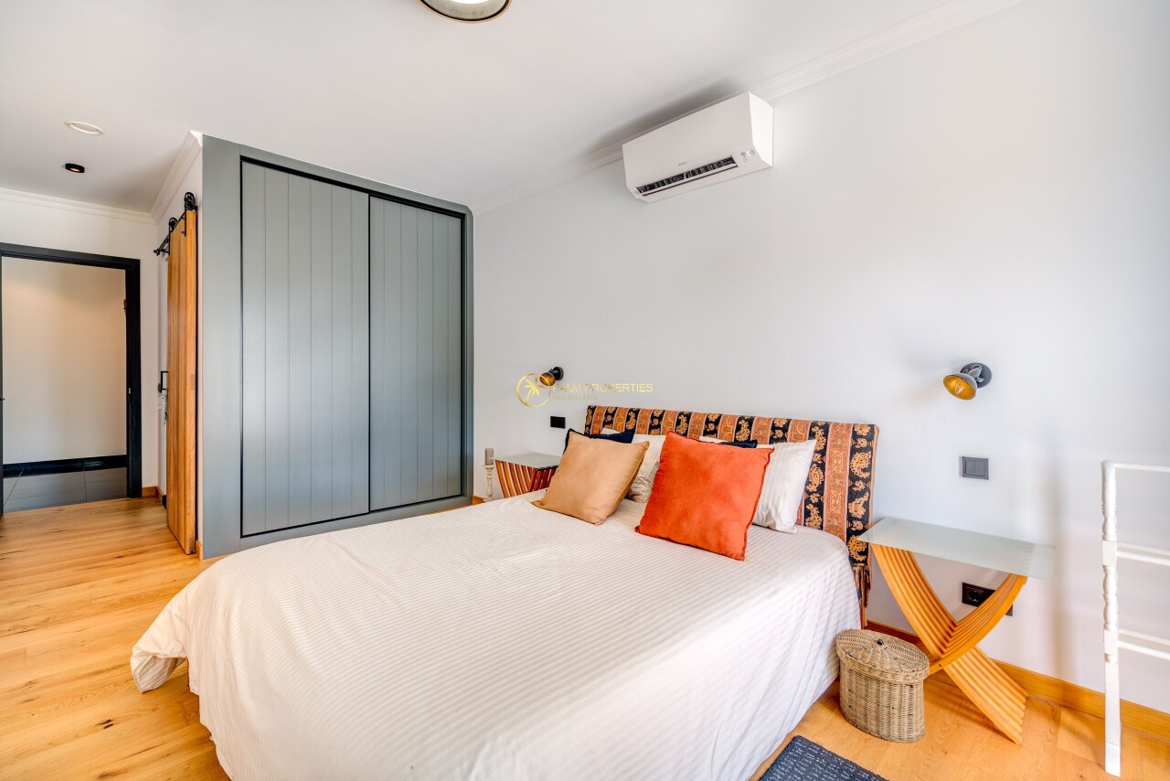 The villa offers three bedrooms, each with an en-suite bathroom and direct access to the heated saltwater infinity pool. All bedrooms and bathrooms feature Giacomini underfloor heating with dual heating and cooling functions, ensuring comfort in all seasons with reduced electricity costs. The master suite includes built-in wardrobes and a dedicated TV space, while its en-suite bathroom features both a shower and a low bathtub. High-quality Brazilian Cherry wood finishes and high ceilings enhance the propertys refined and elegant character.