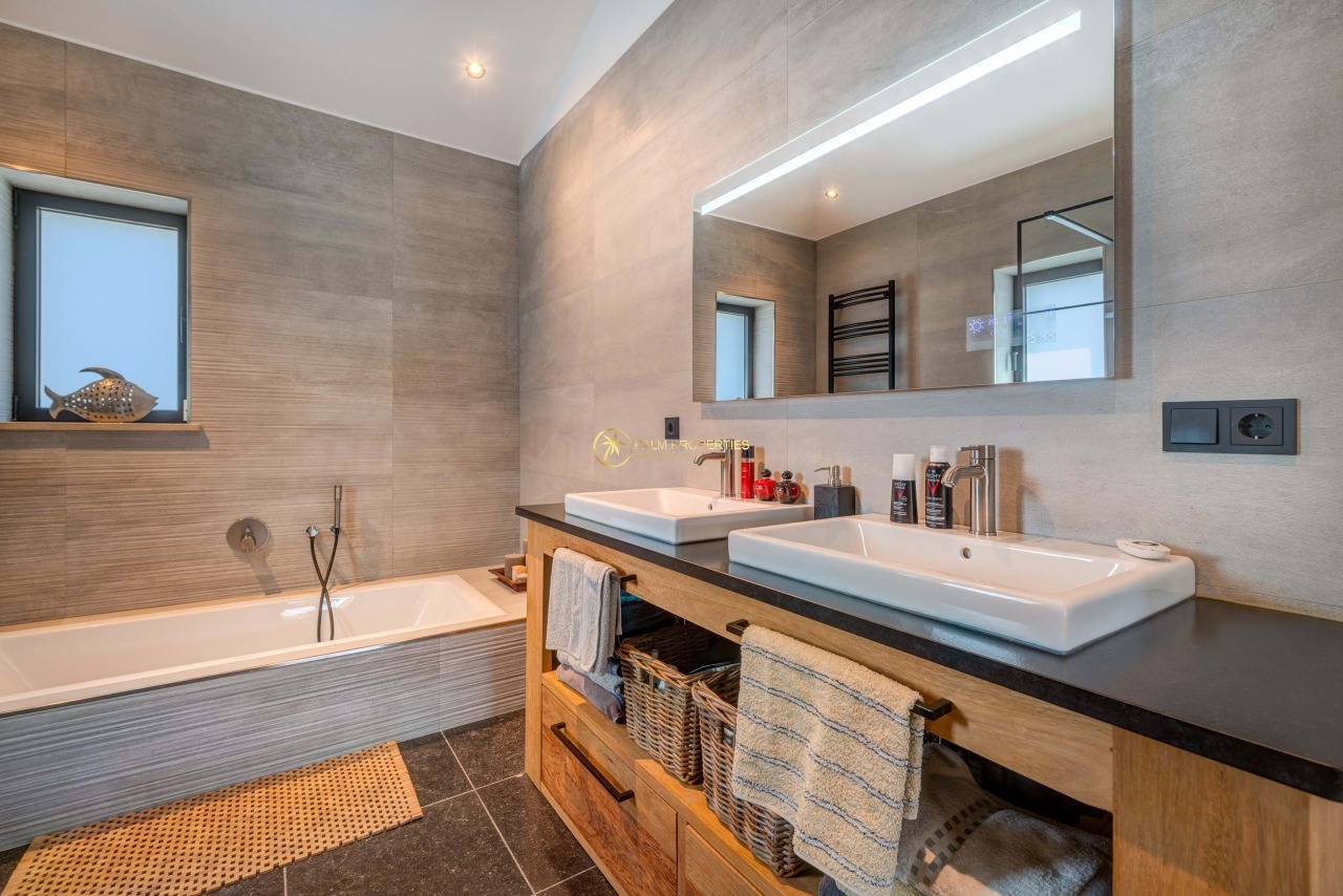 The spacious basement includes a laundry, storage area with underfloor heating, and a garage for 6 to 8 cars. Three technical rooms house efficient systems for heating, electricity, batteries, telecommunications, and Mitsubishi heat recovery ventilation, ensuring an A+ energy certification and maximum efficiency.