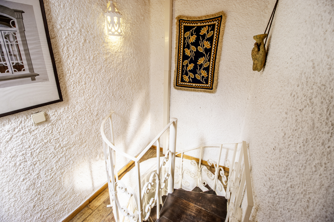 The second floor, accessed via a smaller staircase, features a compact utility area and a generously sized attic space, currently used as additional sleeping accommodation. From here, you step out onto an open roof terrace offering picturesque views over the town and out to sea — a perfect spot to relax or entertain.