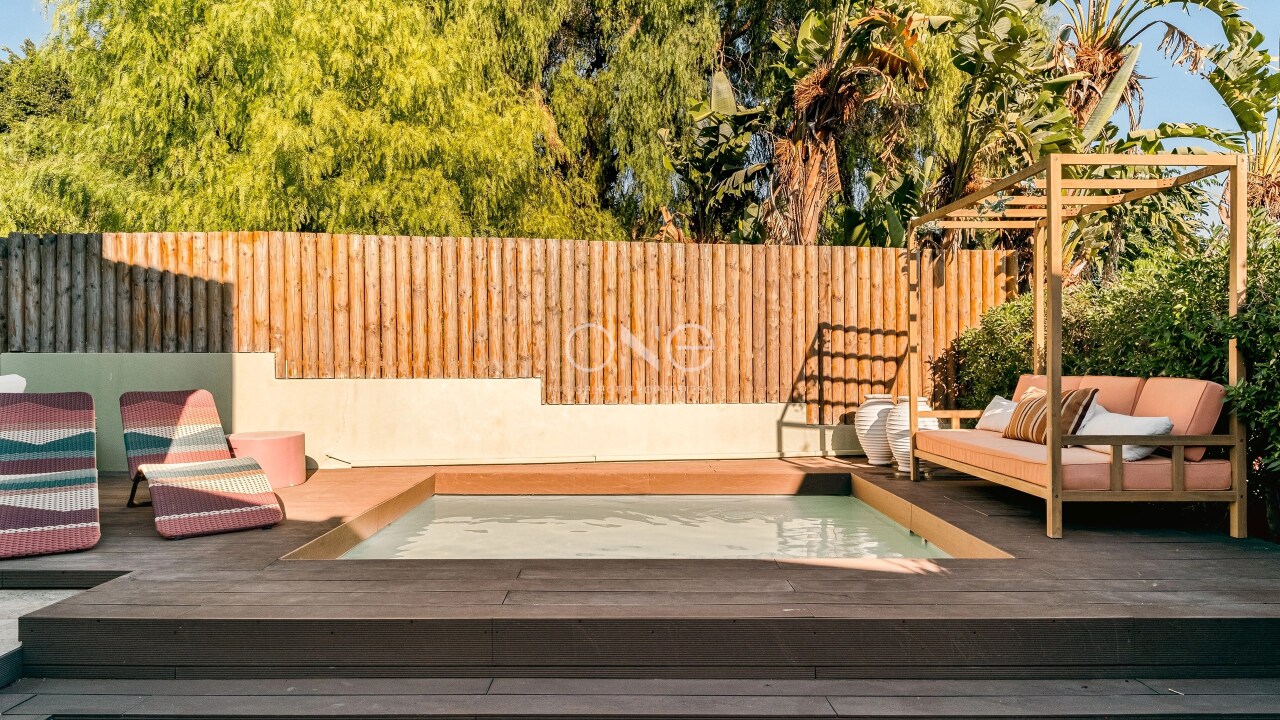 Outdoors, the villa celebrates the Algarves year-round lifestyle with four distinct terraces: a dining area, two lounge zones, a barbecue corner, and a private plunge pool framed by a wooden deck, perfect for entertaining or relaxing in complete privacy. The communal gardens are beautifully maintained by a dedicated gardener and are being renewed with low-water plants, reflecting an environmentally conscious and sustainable approach.