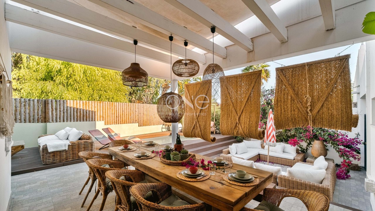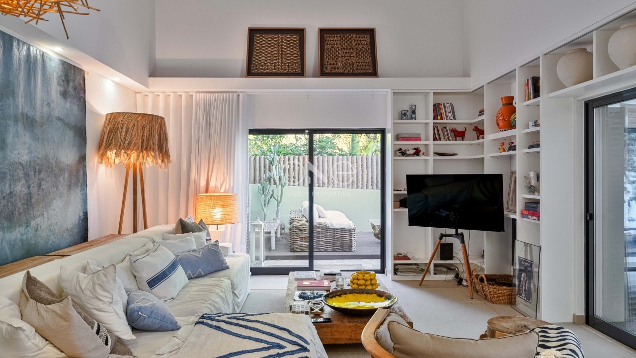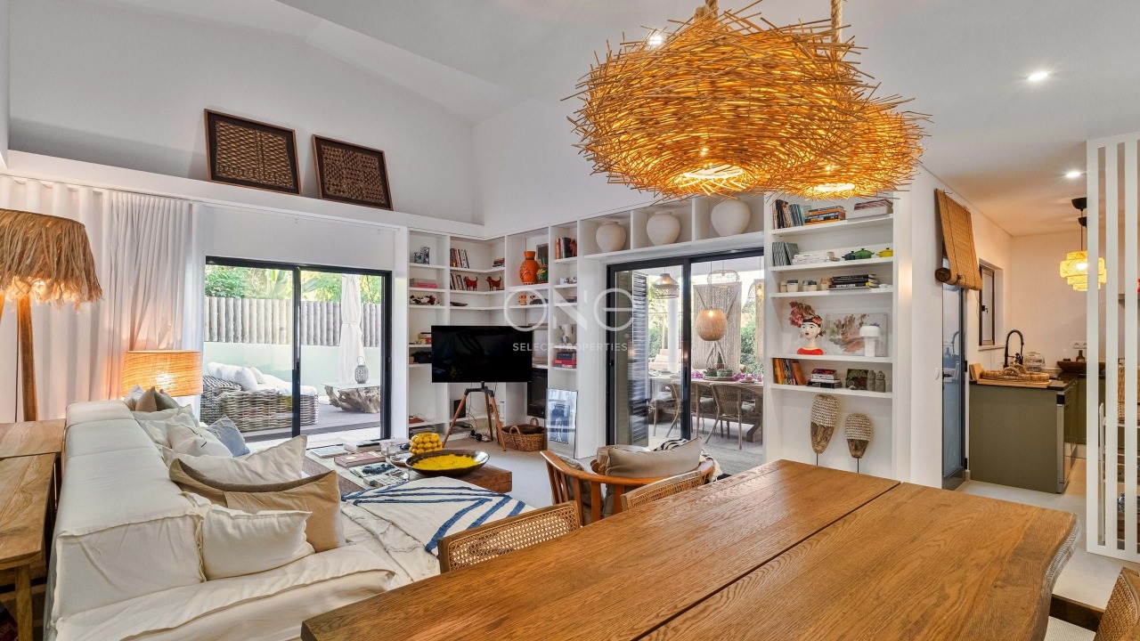 Spread across two levels, the villa reveals a functional and harmonious layout. The ground floor welcomes you into a bright open-plan living and dining area that connects seamlessly to a fully equipped kitchen with direct access to the outdoor lounge and garden. A comfortable suite on this level provides flexibility for guests or for those who value single-level living, complemented by a guest bathroom that enhances practicality.