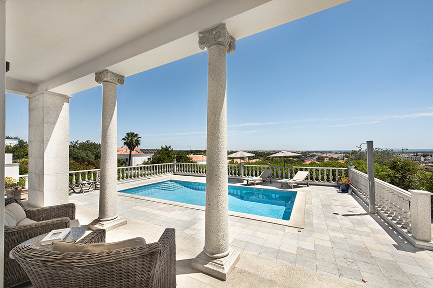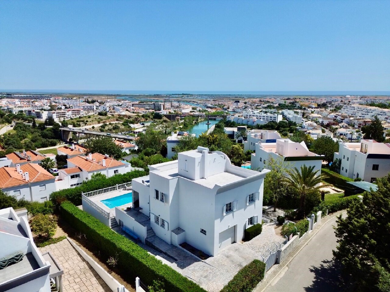 Luxurious 3 bedroom villa on preferred location with heated swimming pool, garage and mature garden close to Tavira town centre. This elegant property was completely renovated in 2017 to the highest standards, using top quality materials throughout. It has been brought up to modern specifications, combining comfort, functionality and luxury in every detail. This spacious villa consists of a hallway with cloak room leading to the large living room with wood burner stove and adjacent dining room, both enjoying panoramic views and lots of light. A spacious fully equipped kitchen with top-of-the-line appliances, a guest bathroom and a TV room (also used for guest staying over) complete the ground floor. From the hallway, a granite staircase with marble banister leads to the 1st floor comprising two double bedrooms sharing a good size bathroom with walk-in shower in addition to a large master bedroom with a Jacuzzi bath and access onto a large terrace (21m2) with Jacuzzi to relax and enjoy the beautiful sea views. The bedrooms feature custom-built wardrobes handcrafted from natural wood, and the bedroom floors are made of high-quality German natural wood. The 2nd floor has a laundry room and access to the large roof terrace with panoramic views towards the sea and the mountains. In addition there is a separate guest area with wine cellar and bathroom; ideal as an office or play area/games room. Access from the living room, dining room and kitchen to large semi covered terraces leading to a dedicated entertainment area with an outdoor kitchen and BBQ, a large table and chairs for that all important alfresco dining, and the heated salt water swimming pool with sun terrace; ideal for those who enjoy soaking up the sun. The villa is surrounded by a landscaped, low maintenance garden with natural stone pathways from where you can enjoy the beautiful views. The property benefits from high quality building materials and finishings, additional insulation, double glazing, air conditioning (Daikin) for heating and cooling, central vacuum cleaning system, electric shutters, under floor heating in all the bathrooms, suspended W.Cs, granite and marble floors, satellite TV, security and domotic system, solar panels for hot water, fast internet (fibre) and high energy efficiency rating A.