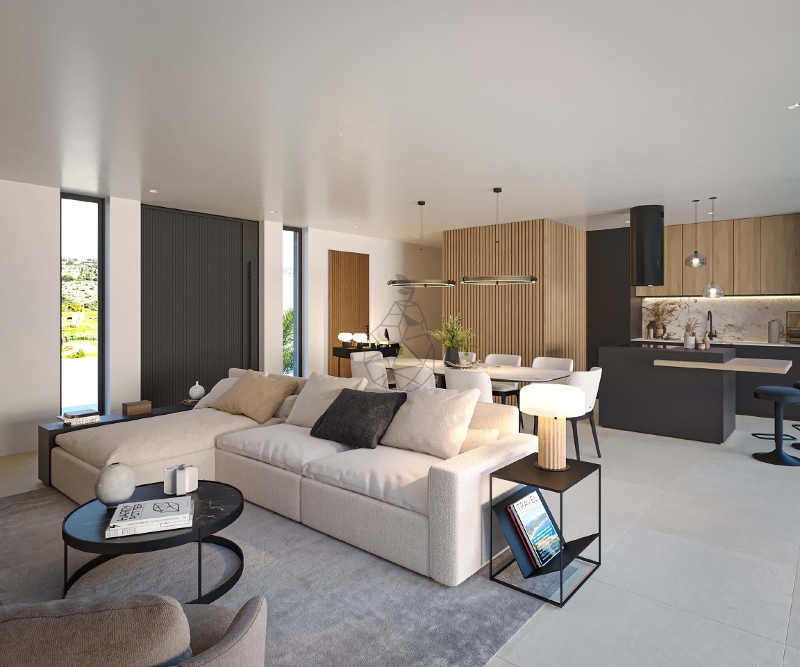Each of the 4 bedrooms is a suite, providing complete privacy and convenience for all residents. The master suite is particularly spacious, with a generous walk-in closet, a whirlpool bath with panoramic views and direct access to a private terrace. All rooms are decorated with luxury finishes and have large windows, making the most of the views. The living room is spacious, with a modern and elegant design. The environment provides a sense of fluidity between indoor and outdoor spaces, making it perfect for entertaining or relaxing. The adjacent dining area has a lovely view and is ideal for socializing with family or friends.