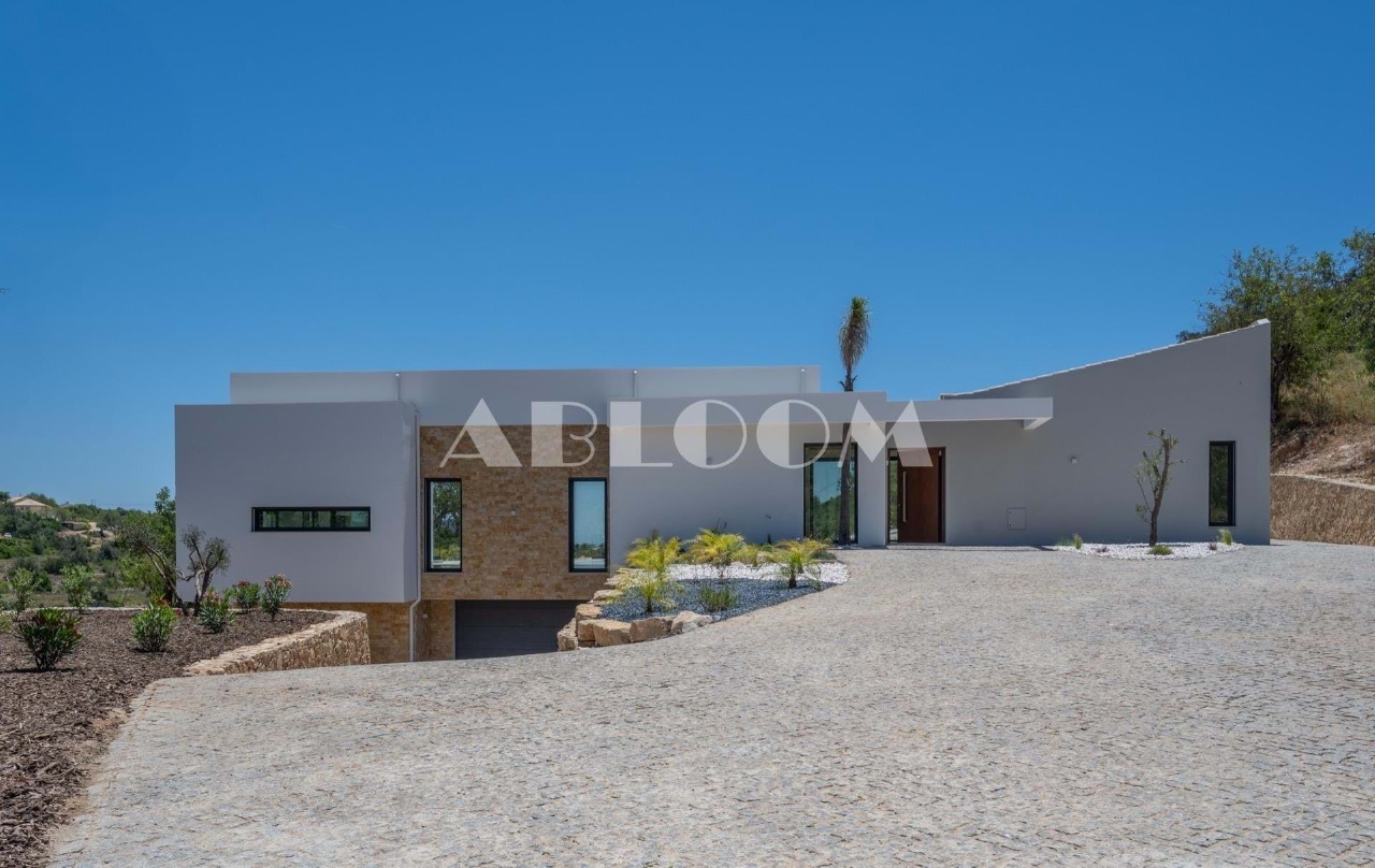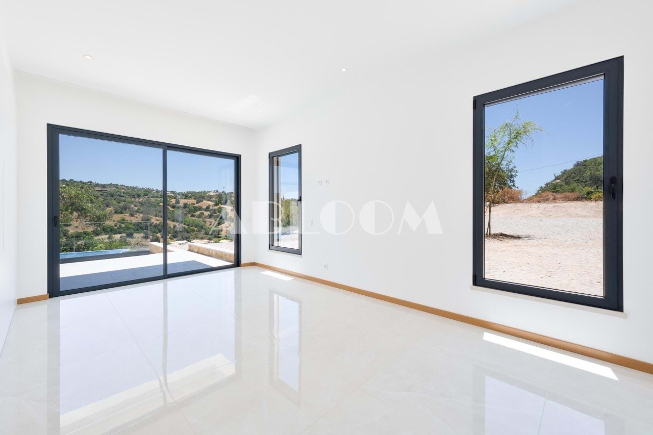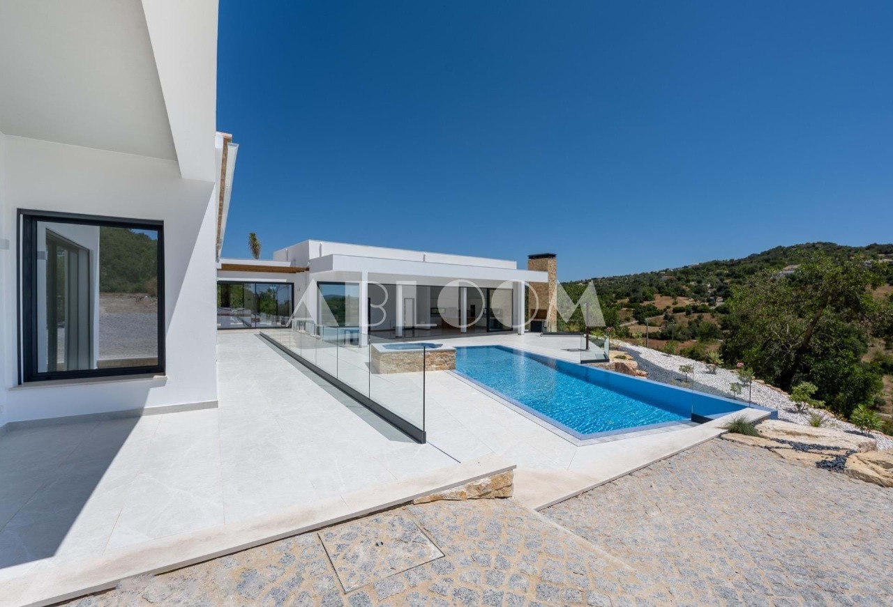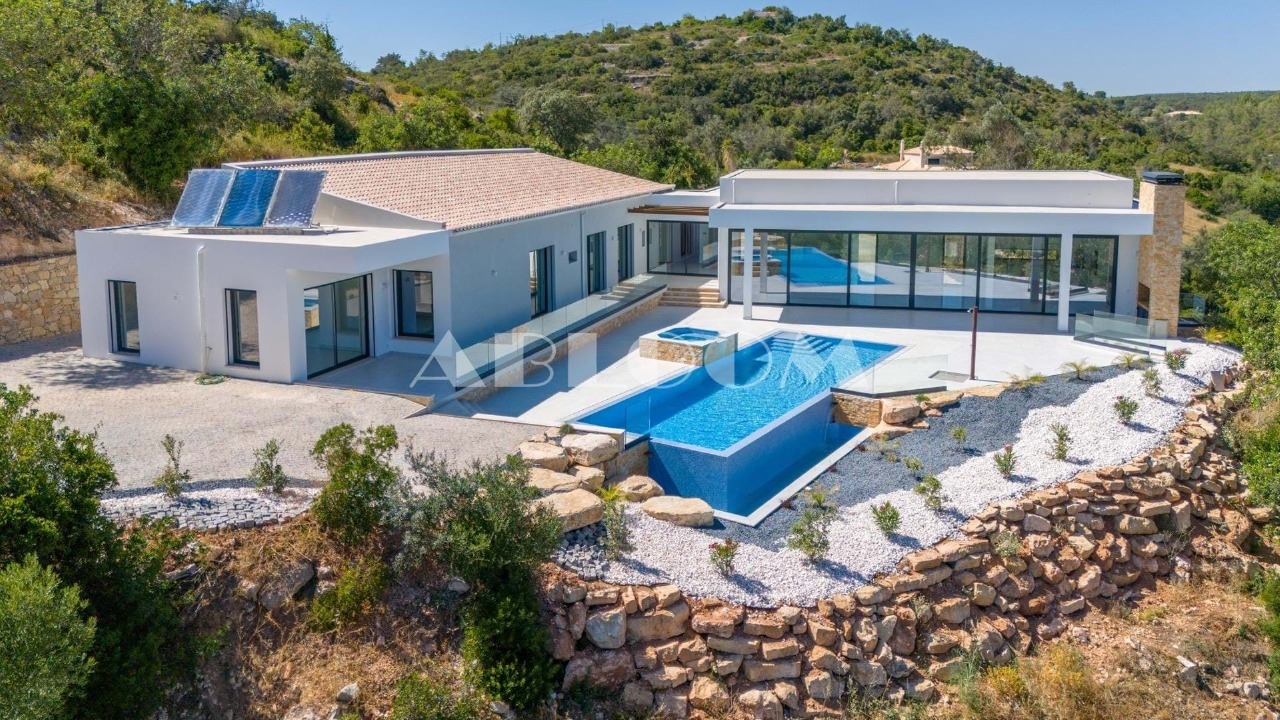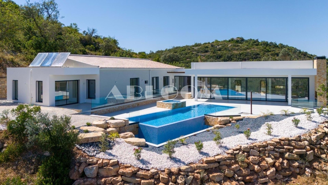 A brand new 4 bedroom modern villa with heated infinity pool perched on a peaceful hillside with beautiful views over the picturesque valley and the ocean in the distance. Set on a vertiginous plot of over 3 hectares, the property is located in the sought after neighbourhood of Vale Telheiro, only a 5 min drive to the popular town of Loule.