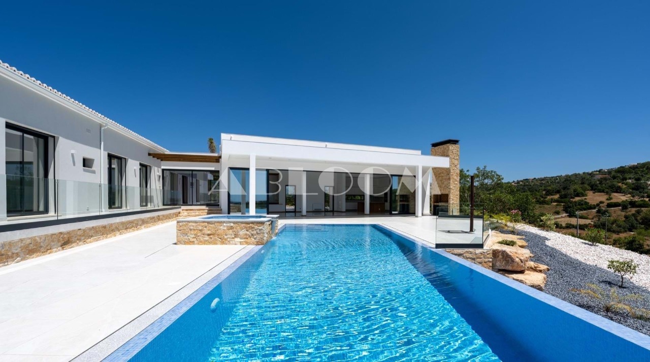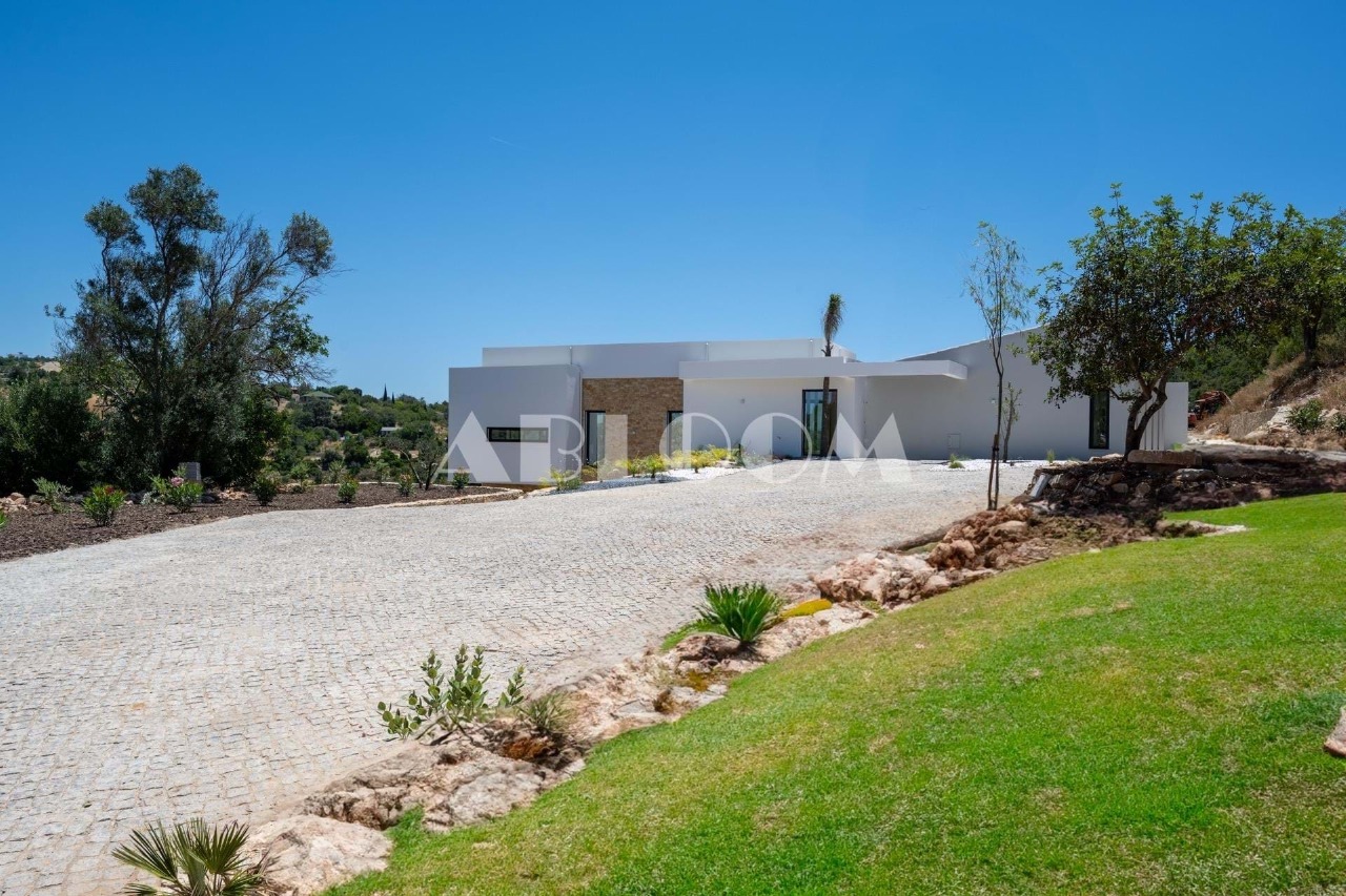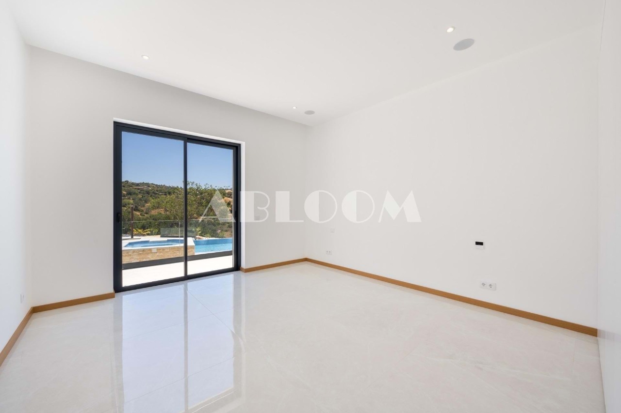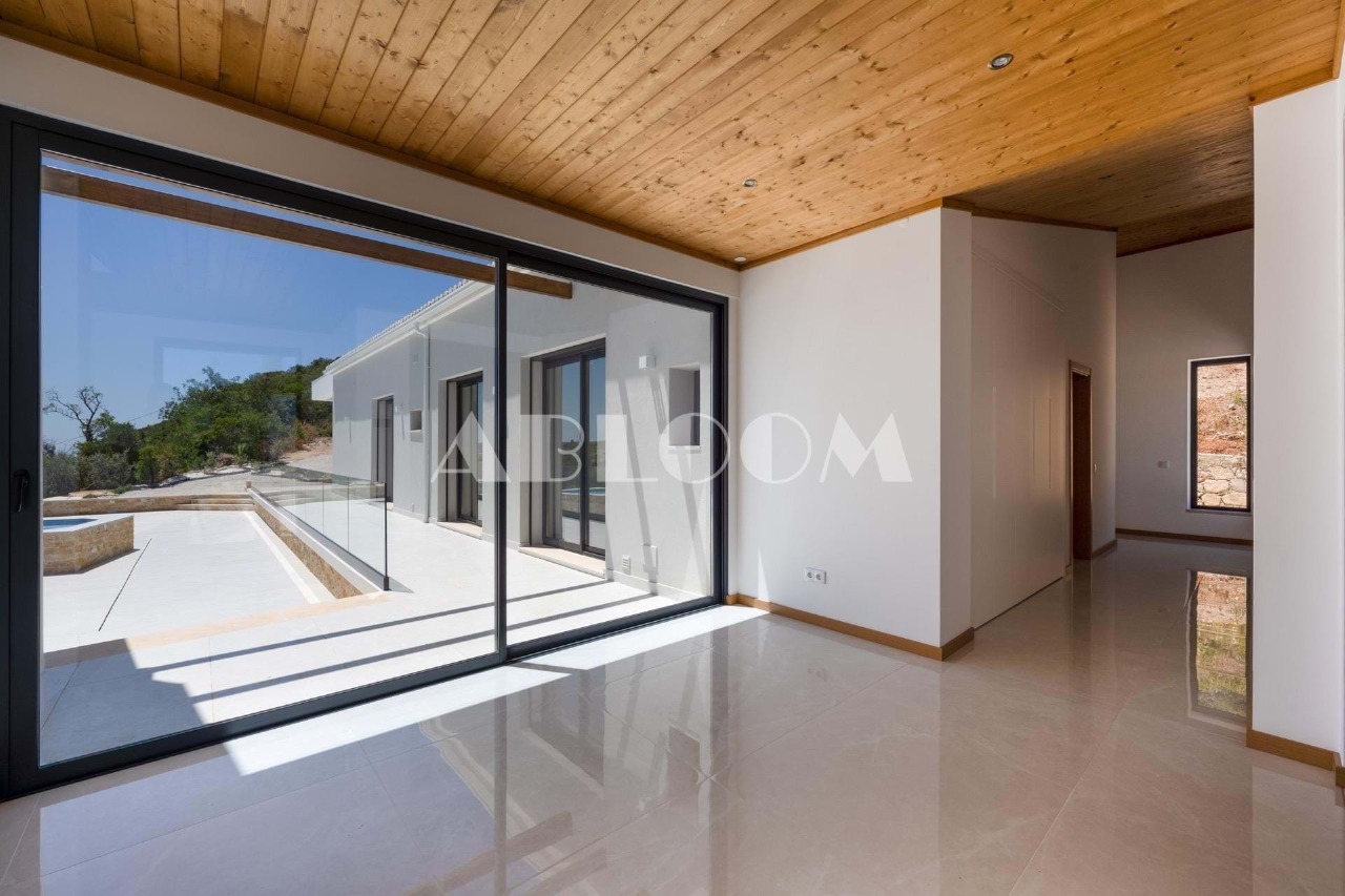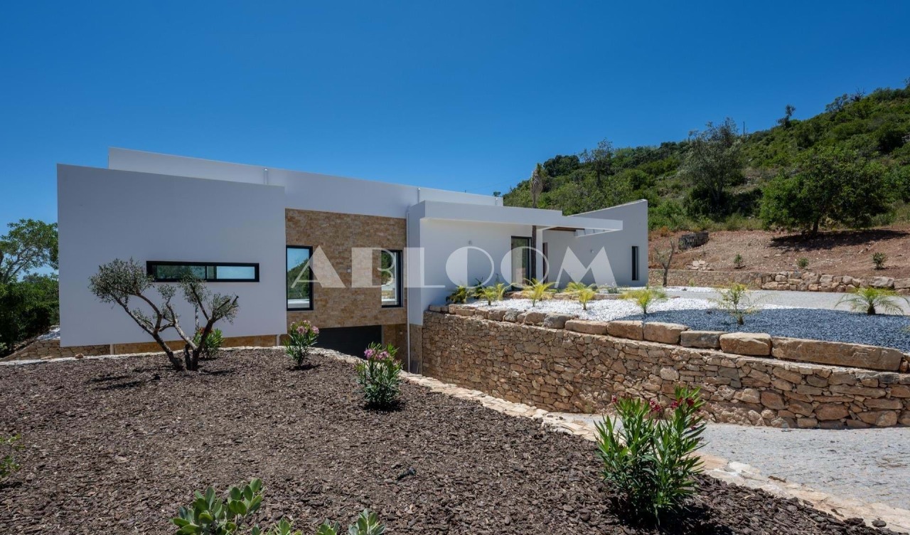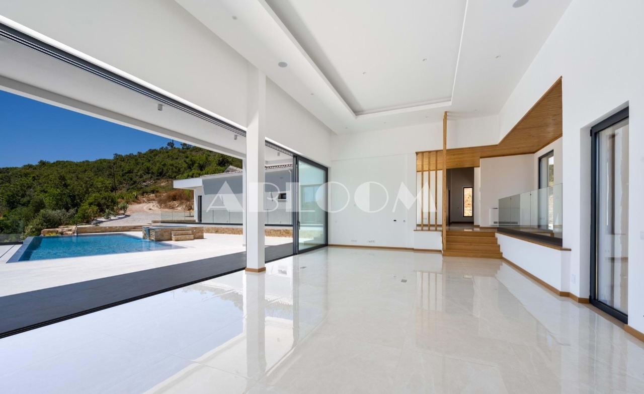 A brand new 4 bedroom modern villa with heated infinity pool perched on a peaceful hillside with beautiful views over the picturesque valley and the ocean in the distance. Set on a vertiginous plot of over 3 hectares, the property is located in the sought after neighbourhood of Vale Telheiro, only a 5 min drive to the popular town of Loule.
