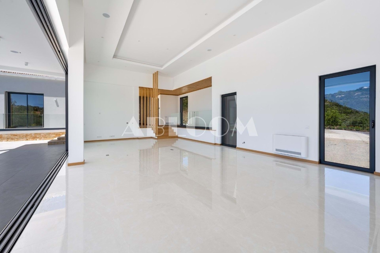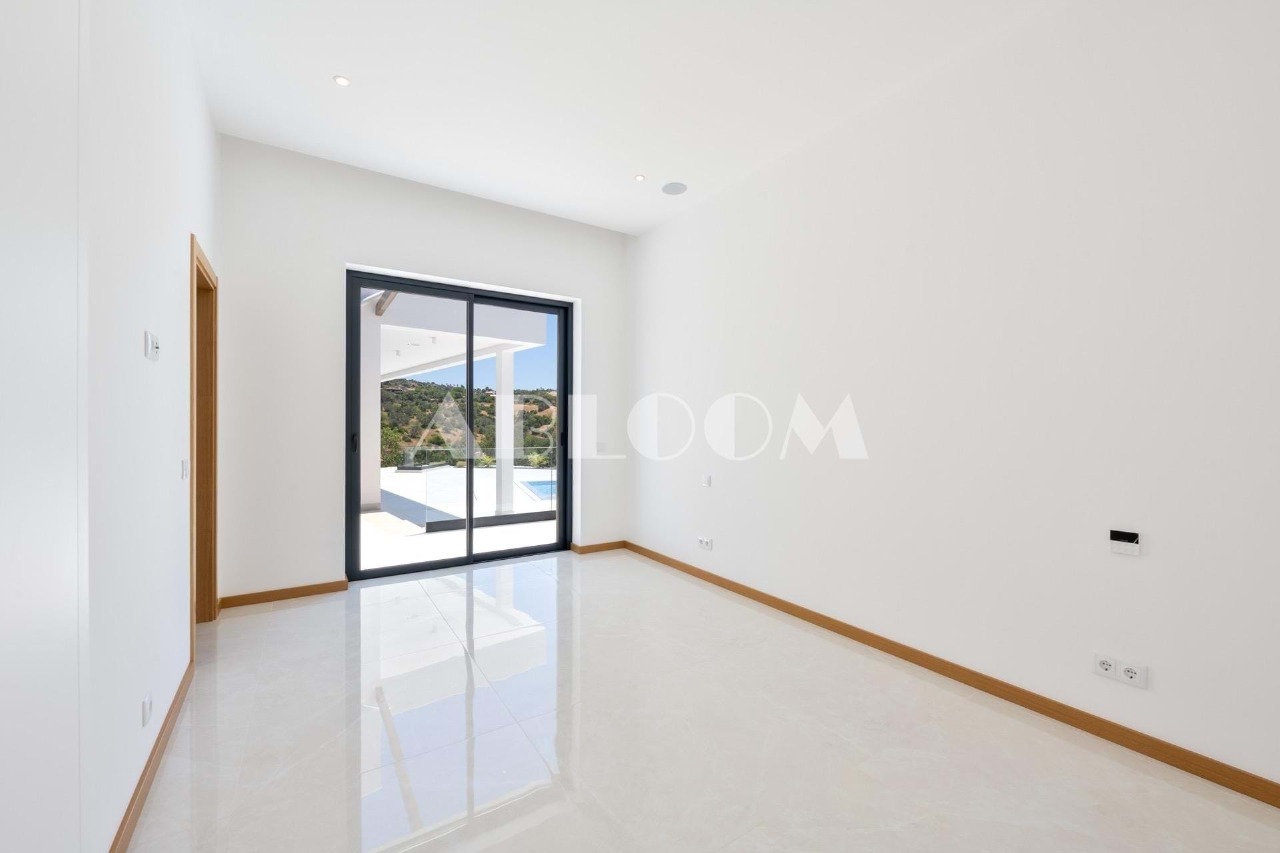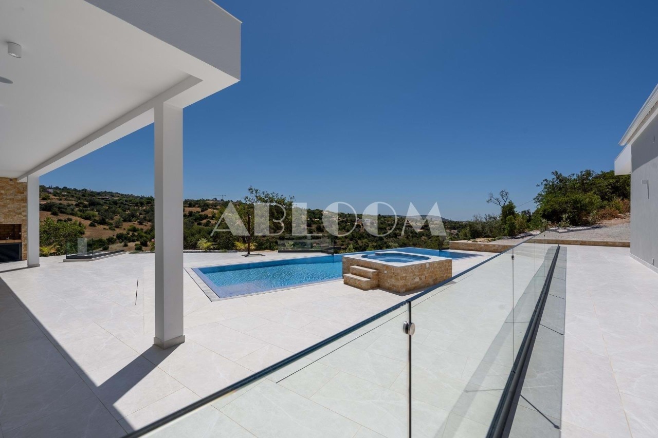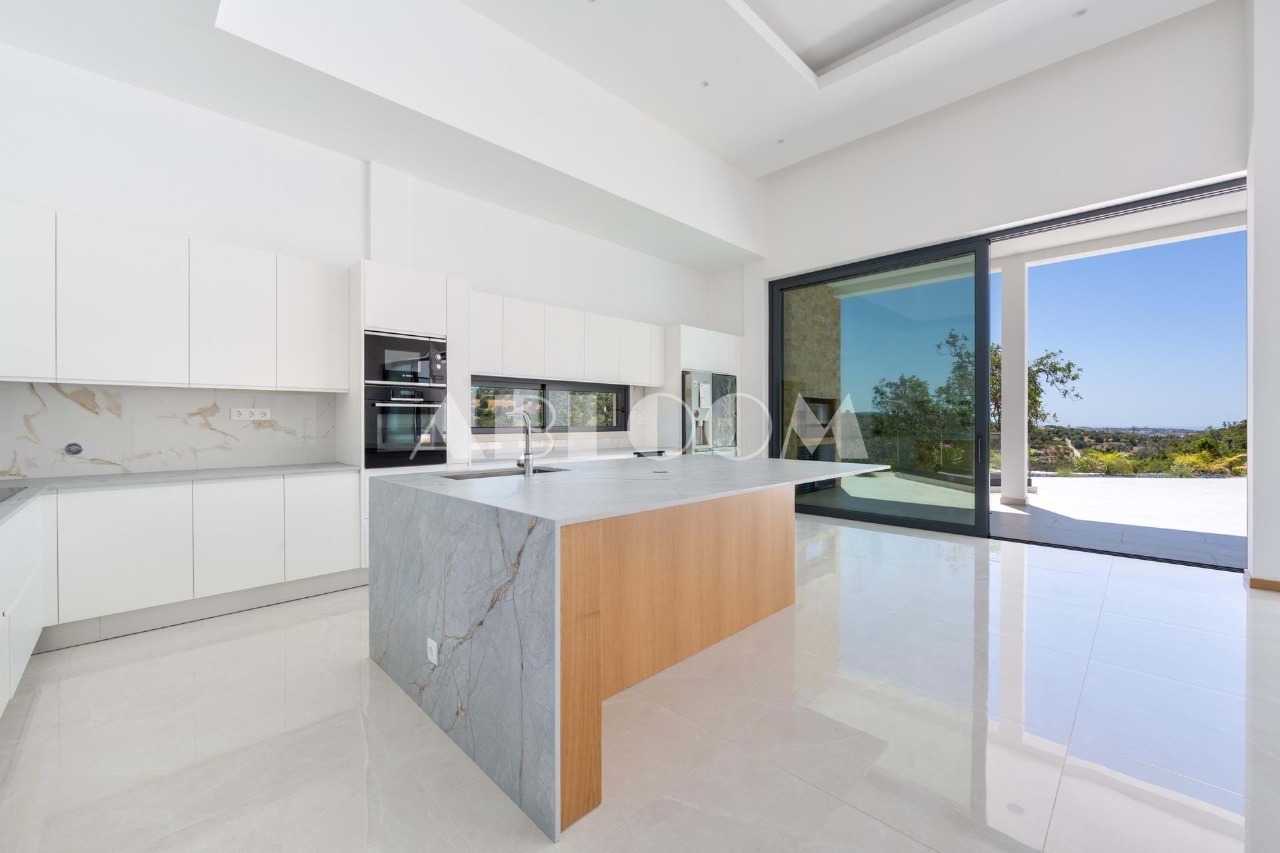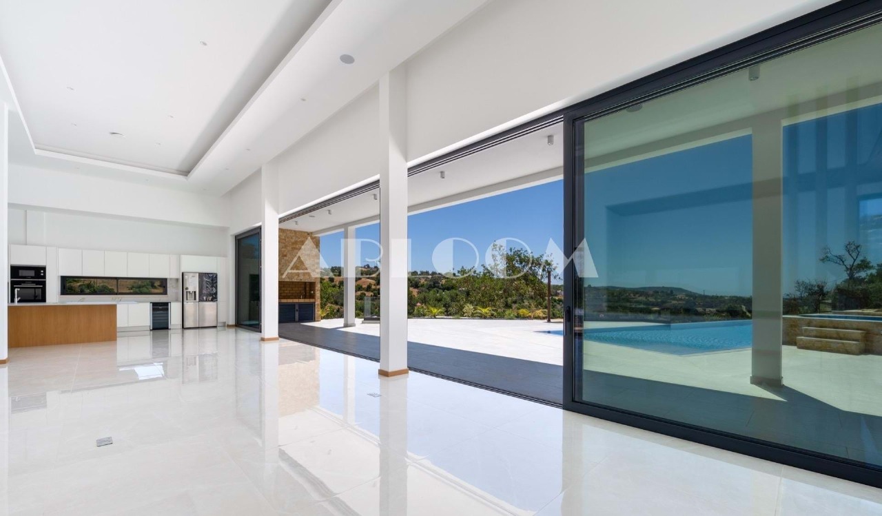 A brand new 4 bedroom modern villa with heated infinity pool perched on a peaceful hillside with beautiful views over the picturesque valley and the ocean in the distance. Set on a vertiginous plot of over 3 hectares, the property is located in the sought after neighbourhood of Vale Telheiro, only a 5 min drive to the popular town of Loule.