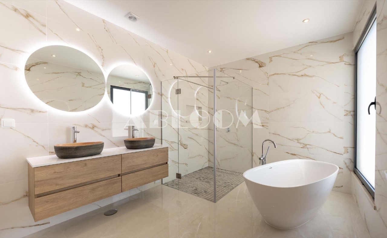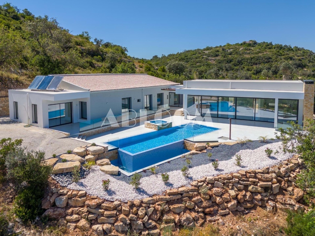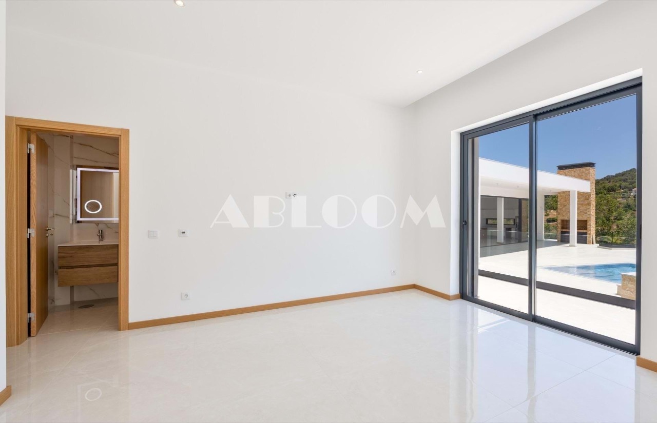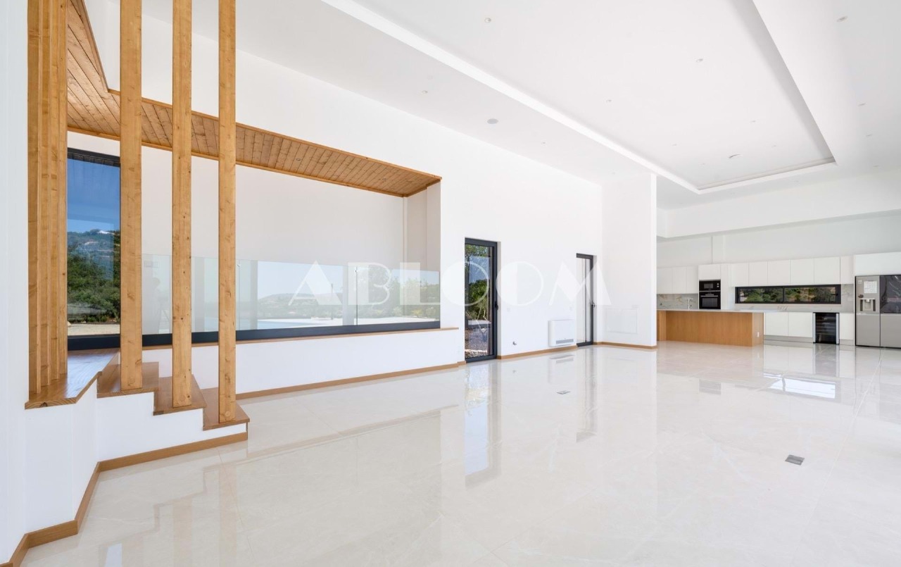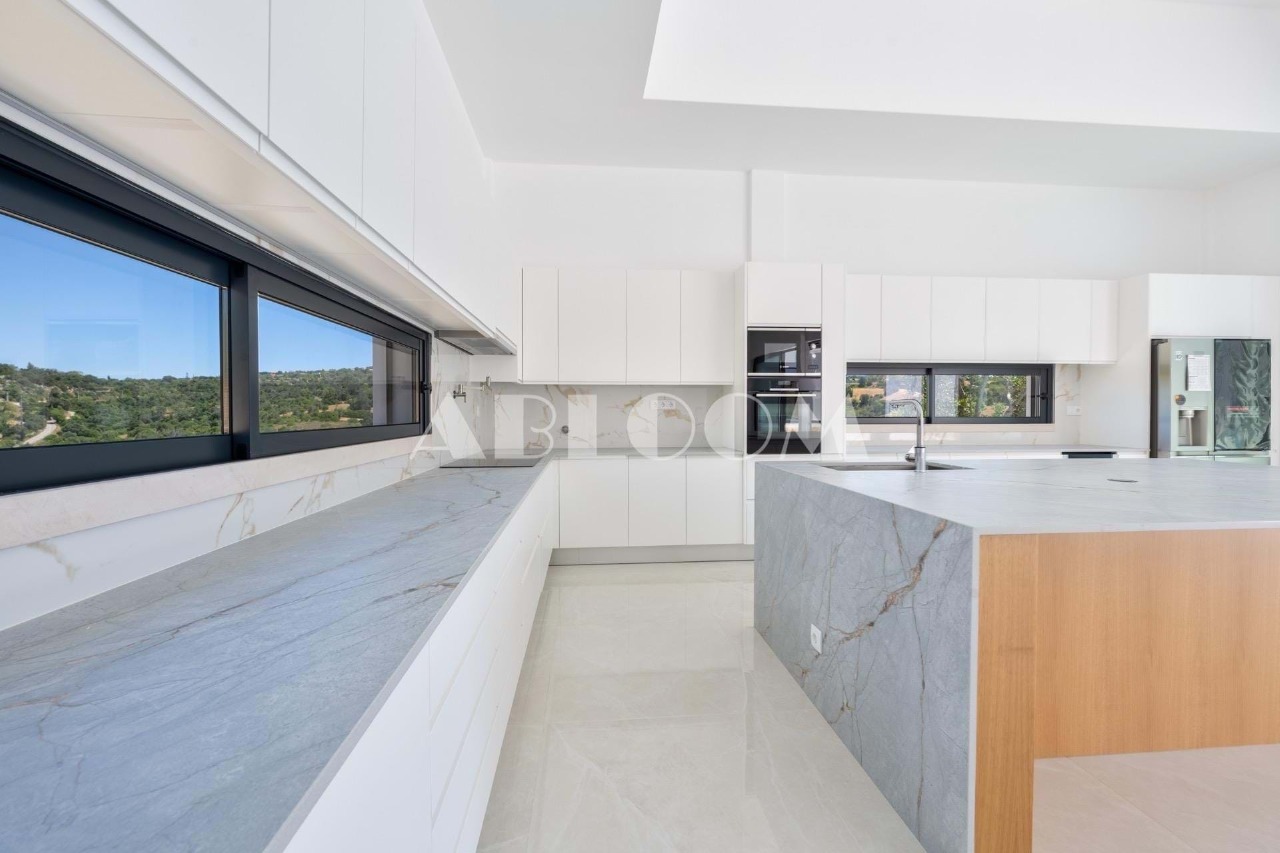 A brand new 4 bedroom modern villa with heated infinity pool perched on a peaceful hillside with beautiful views over the picturesque valley and the ocean in the distance. Set on a vertiginous plot of over 3 hectares, the property is located in the sought after neighbourhood of Vale Telheiro, only a 5 min drive to the popular town of Loule.