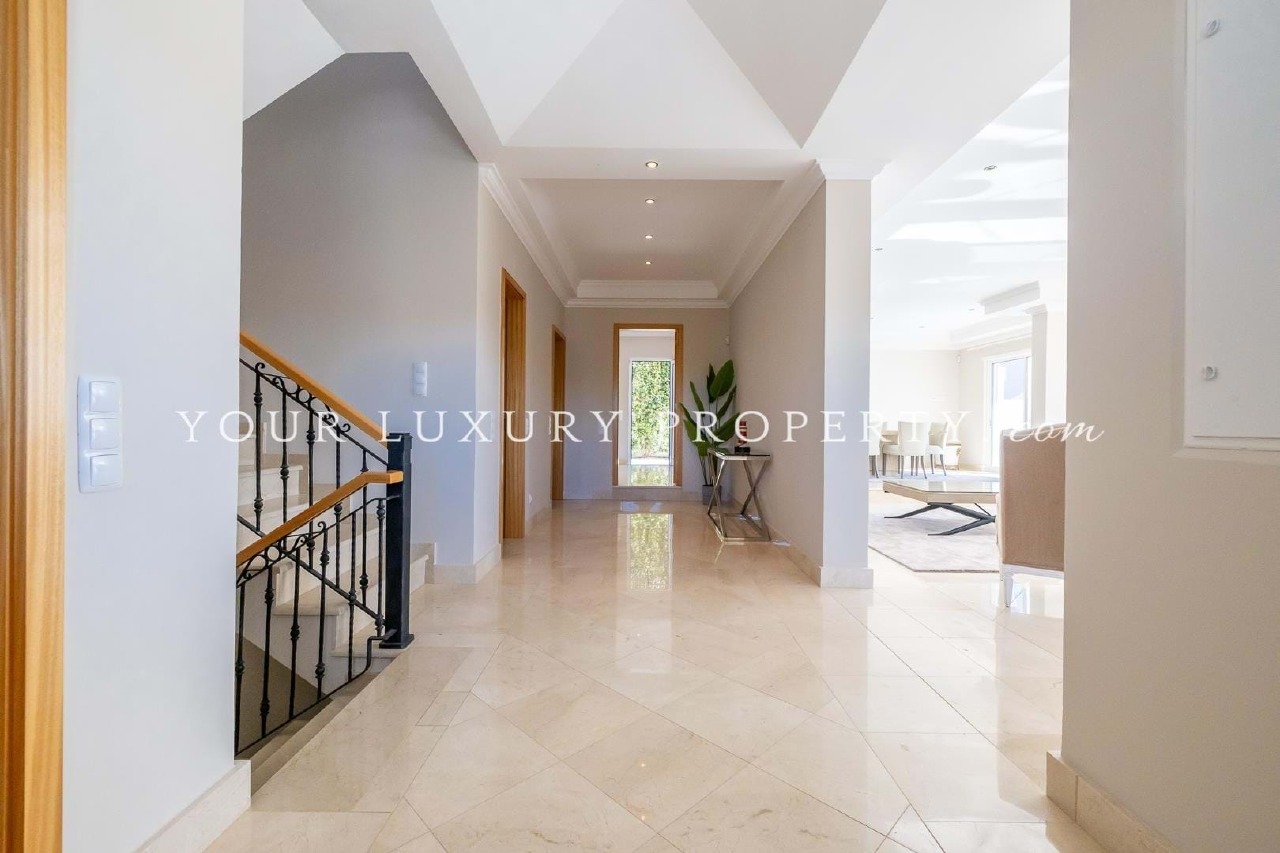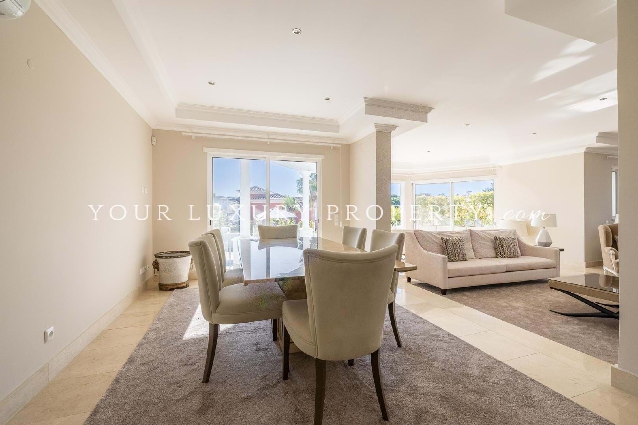 This stunning luxury villa is located in the prestigious urbanization The Village, only a few minutes away from the luxury resorts of Vale do Lobo and Quinta do Lago. The villa is set on an elevated plot giving it a lovely view over the urbanization with even some distant sea views from ground floor terraces. The outdoor area features a South-South East facing pool terrace surrounded by a well-maintained garden, a barbecue area and several different terraces and seating areas. The property comprises of: on ground floor level, entrance hall with guest toilet, two en-suite bedrooms, open plan living and dining room area opening onto the sunny pool terrace, cosy seating area in front of a lovely fire place, spacious kitchen with Bosch appliances. On first floor level there are a further three en-suite bedrooms. At basement level the villa offers: a laundry room, three multi-purpose rooms to be used as per the future owners needs (office, gym, home cinema, etc.) and a large garage with space for 4 cars. The villa has under floor heating, air-conditioning throughout and electric shutters. This property is ideal as a primary residence, vacation home, or investment opportunity.