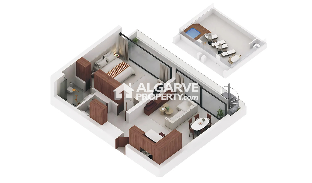 1-Bedroom Apartments: Perfect for those seeking more space, the 1-bedroom apartments include balconies with picturesque views of the stunning surroundings of Carvoeiro (A41, A42, A51, A52, B21, B22, B23, B24). For a more premium experience, some units feature rooftop terraces with Jacuzzis, combining luxury with the comfort of the outdoor environment (A65, A66, A71, A72, B29, B30, B31, B32).