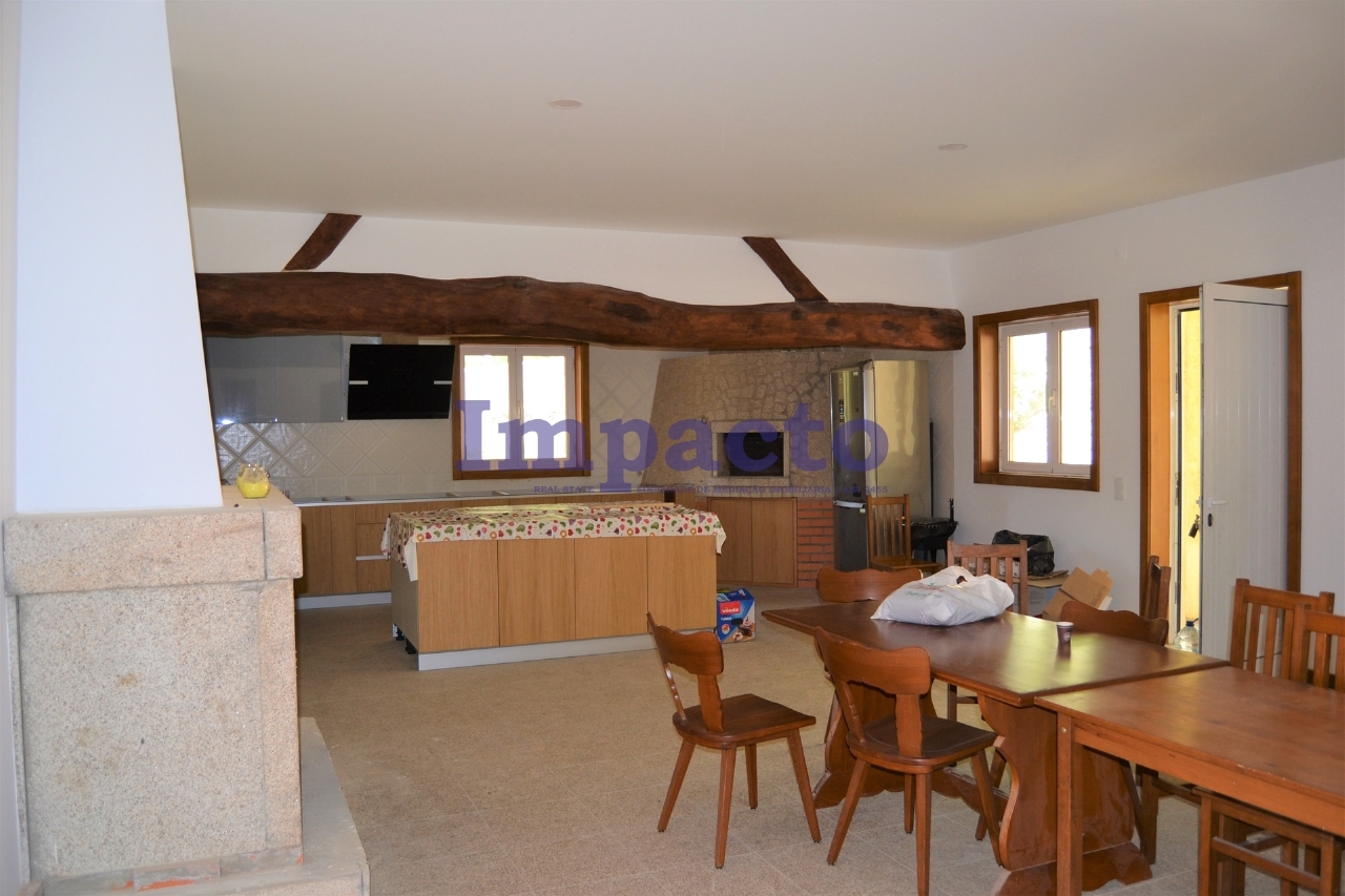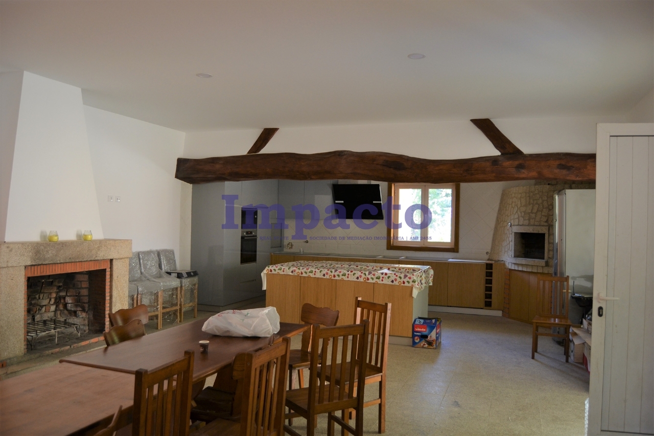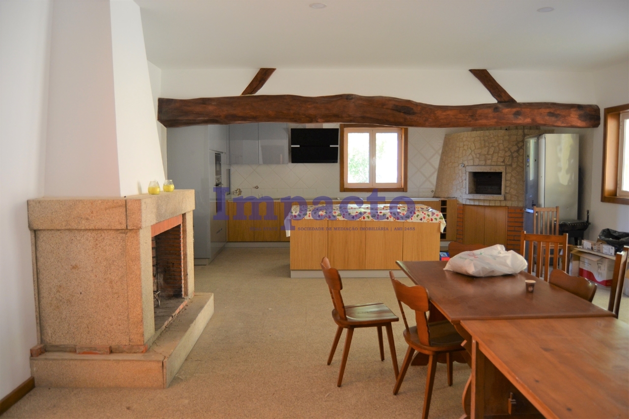 Detached house T6 in the process of remodeling and finishing 2 floors. At the level of the ground floor consists of kitchen furnished and equipped with island, wood oven, fireplace and pantry, served by a storage room for pantry, laundry, entrance hall, living room with fireplace, full bathroom, five suites with built-in cabinets and full bathrooms. It is equipped with pre-installation of central heating, double-glazed aluminium window frames. The basement is large and has natural light. Outside, all around the house, the floor is in Portuguese calçada. The property has 3 wells with water, a natural spring and several species of trees on the property. The value advertised is for the completed house.